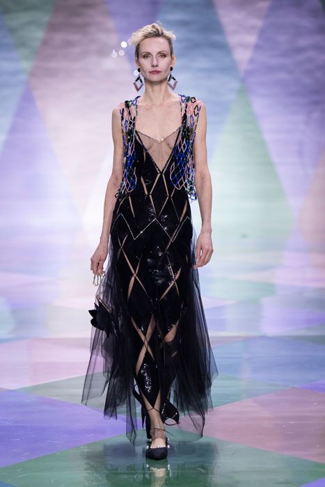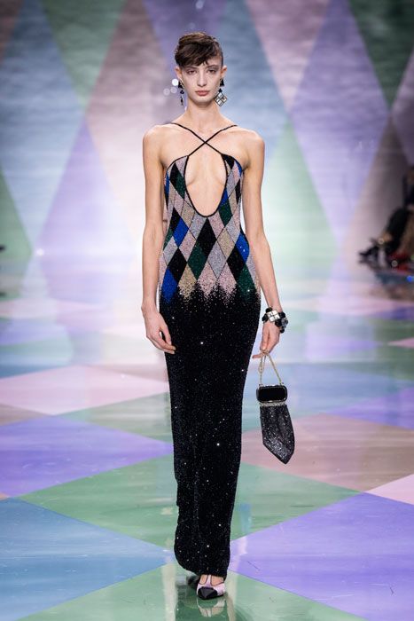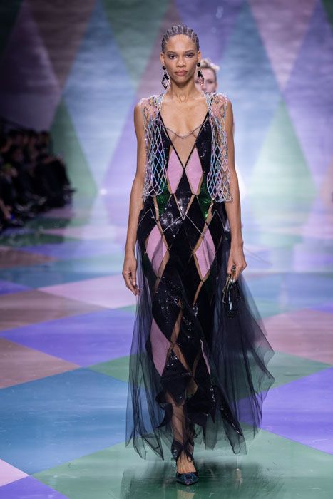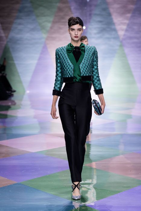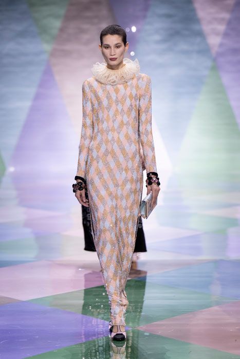 La sartorialità è esaltata da piccole giacche gioiello, gonne lunghe, pantaloni fluidi e fourreaux che disegnano silhouette seducenti. I motivi di losanghe, ispirati a un dipinto di Arlecchino, ritmano le superfici con geometrie colorate, mentre i bordi neri e le piccole gorgère illuminano gli abiti.