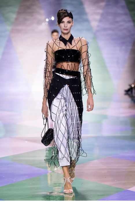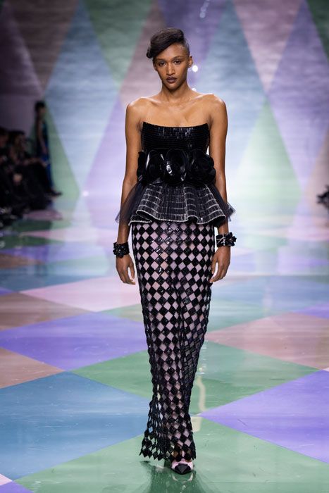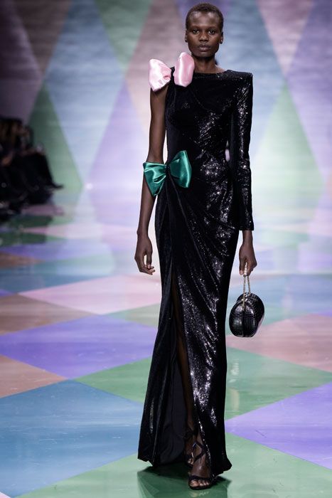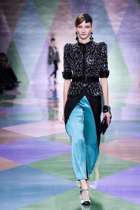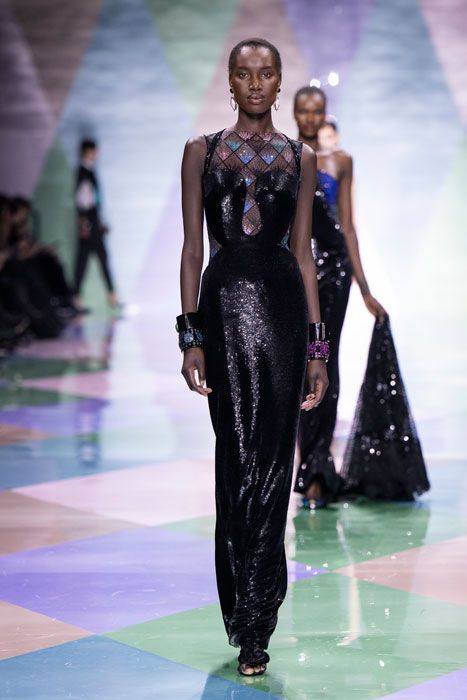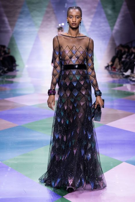 La sfilata di Giorgio Armani Privè a Parigi porta in scena una collezione leggera e frizzante, ispirata a un quadro di Arlecchino e alle suggestioni del Carnevale di Venezia.