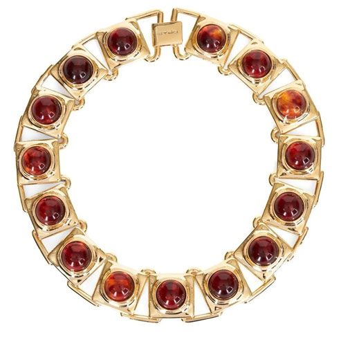 Il choker di Etro, dal design minimale e dal gusto bohémien, si chiude con un fermaglio color ambra, ottone e perline colorate. Una proposta trendy per look chic e vacation style.
