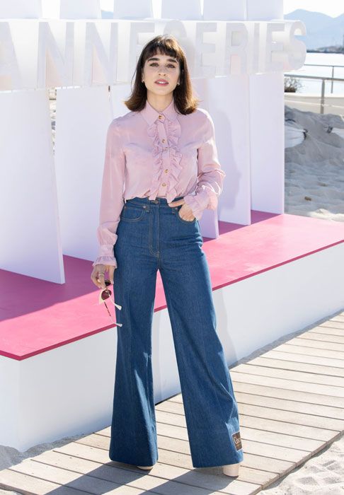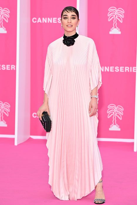Per il pink carpet di chiusura del Canneseries International Festival, ha indossato un abito lungo in seta rosa cipria plissé con dettaglio fiore nero e nastro in velluto. Clutch in raso e sandali in suede nero con cristalli.
