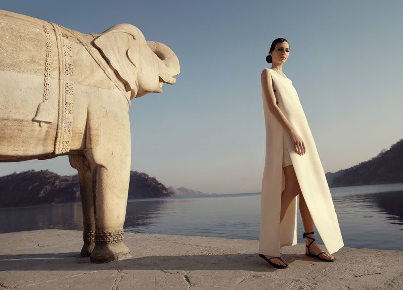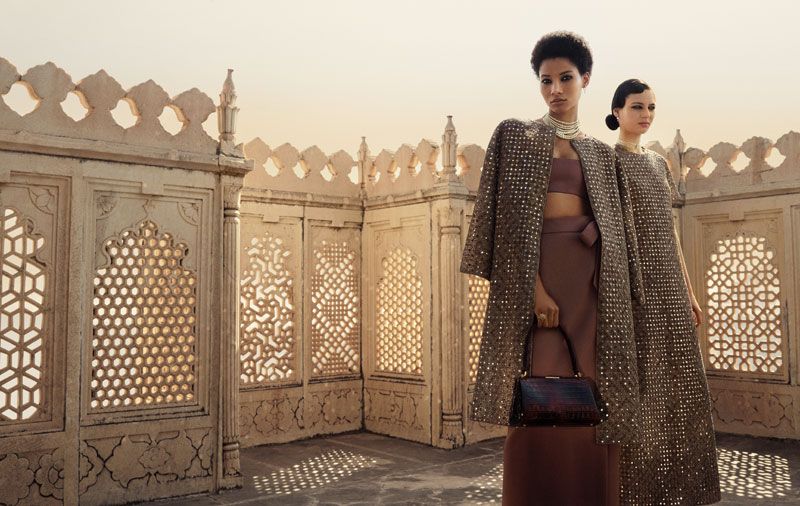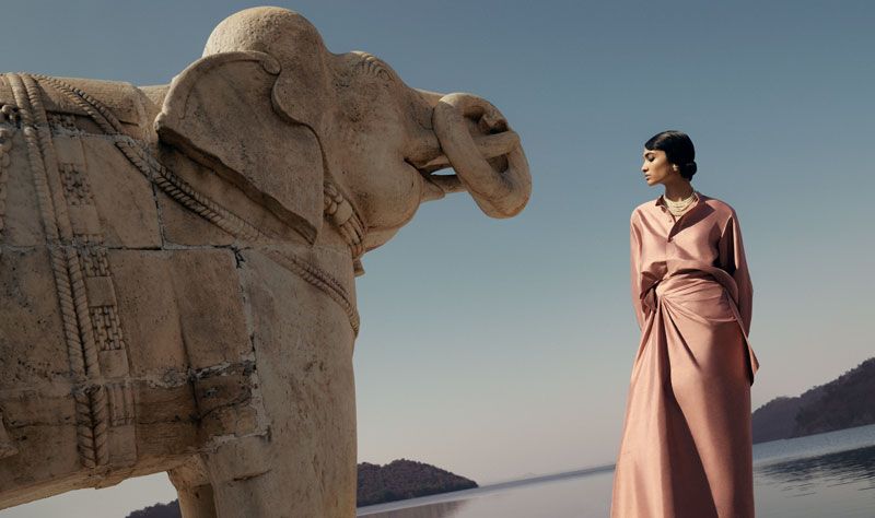 Un viaggio nella moda e nel lifestyle all’insegna di lusso, artigianato ed esotismo. Le modelle sfilano tra scenografie che rievocano i sontuosi palazzi e i romanzeschi laghi di Udaipur, avvolte in preziose stoffe dai colori accesi e dalle lavorazioni ricercate. Gli abiti di alta moda e gli accessori della collezione giocano con silhouette inedite e trame elaborate, esaltando le maestrie artigianali indiane come ricamo, stampa e colorazione tessile.