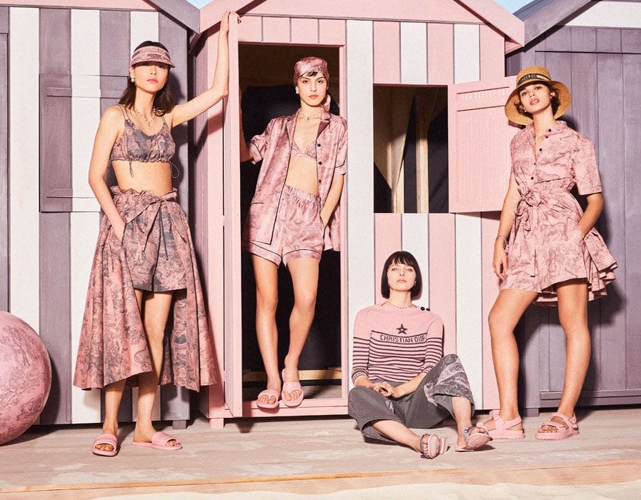 Jupes, robes, shorts, maillots de bain: la Toile de Jouy Sauvage abbraccia ogni capo e si racconta in rosa e grigio, colori cari a Monsieur Dior. Ma non finisce qui! Foulards, borse Lady Dior e Dior Book Tote, mules Dway, escarpins J’Adior: ogni accessorio è un tuffo nel glamour.