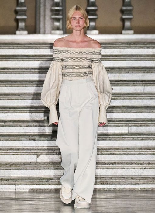 Maniche gigot, gonne che sfiorano le caviglie, cappe al gomito e da indossare con papillon: la silhouette sartoriale e lo stile austero del 1900 vengono reinterpretate in chiave moderna in questa collezione Max Mara.