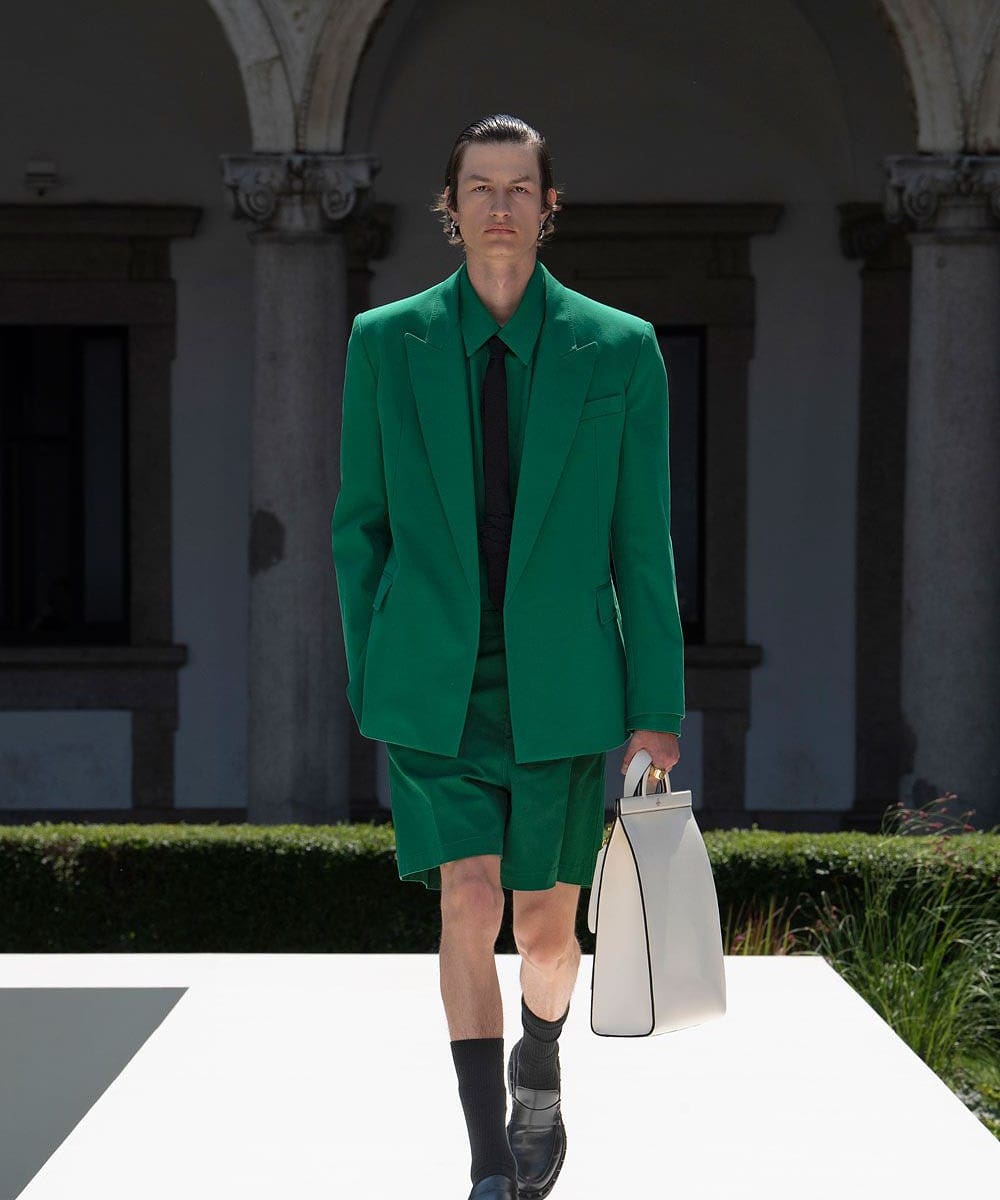 I blazer e i cappotti sartoriali sono portati con shorts corti, addolciti e resi più casual, con l’aggiunta di una nota giovane ed energica. I classici capi per il lavoro, le uniformi della virilità che ci sono familiari, sono trattati con delicatezza, mentre le forme di tutta la collezione evolvono in modo sottile, quasi