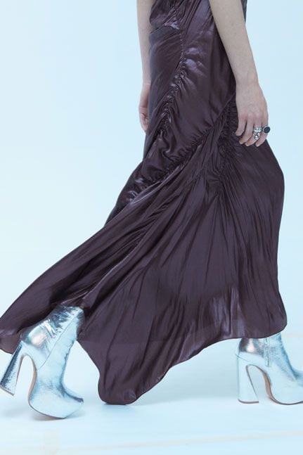 Ma non solo. Nel 1973, con David Bowie e il primo concerto di Ziggy Stardust, nacque il mito di un’androginia glam. Questo spirito androgino e audace ritorna brillante nella collezione, dove gli abiti puri dalle forme essenziali sono impreziositi da maglie metalliche e stivaletti Seventies argentati. L’androgino si mescola al glam rock, creando un’atmosfera audace e iconica.