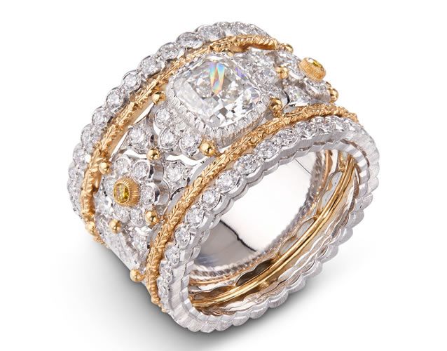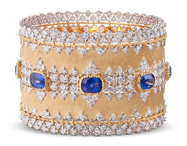 Ogni gioiello è un pezzo unico, la reinterpretazione innovativa dei disegni geometrici dei mosaici bizantini, un’arte che Mario Buccellati, il fondatore della maison, aveva già sperimentato negli anni ’20. In ogni monile, le pietre preziose si fondono con l’oro per creare disegni straordinariamente dettagliati e ricchi di luce, con forme moderne e impreviste e abbinamenti cromatici regalano effetti di sorprendente eleganza.