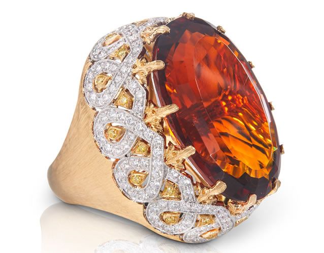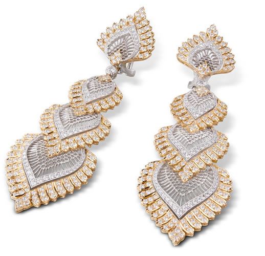 Grande ricchezza di dettagli e l’uso di metalli e pietre preziose di altissima qualità per dare vita a orecchini pendenti in oro giallo impreziositi da diamanti taglio rosa, collane a bavaglio composte da elementi in oro bianco e brillanti e gli anelli a fascia sforata con dettagli floreali in oro bianco e diamanti, preziosità pura