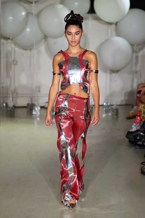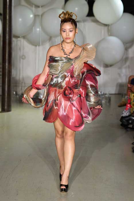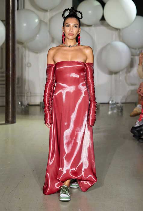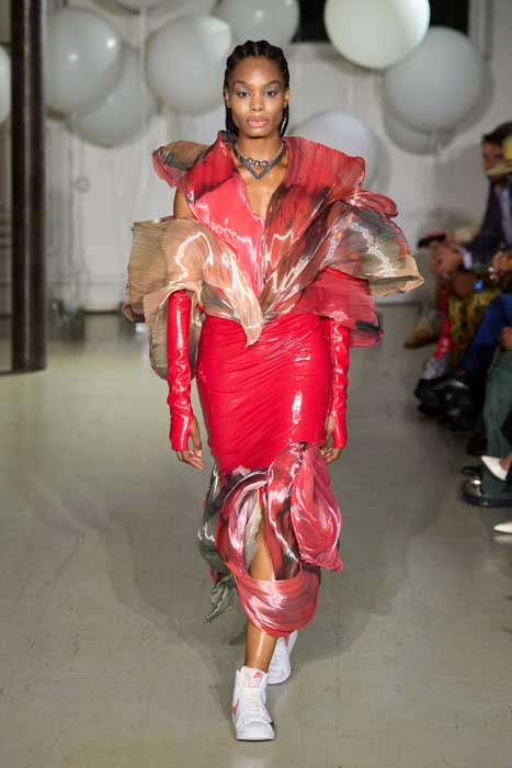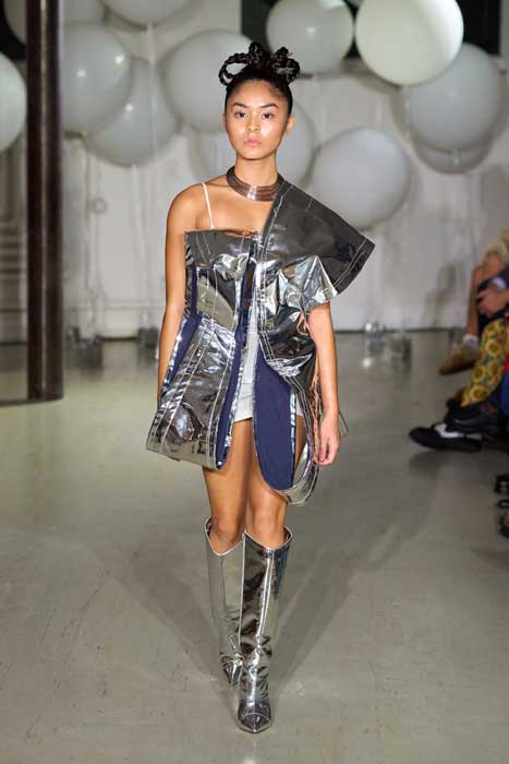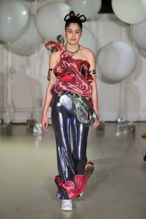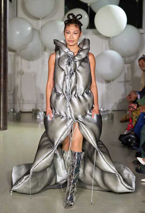 Capi eterei ad inizio sfilata rappresentano il sentirsi smarriti e isolati. Poi silhouette audaci rispecchiano la forza ritrovata da Ashlyn per superare il buio del passato. L’apoteosi con un gigantesco piumino-fenice, un manifesto di rinascita e possibilità infinite.