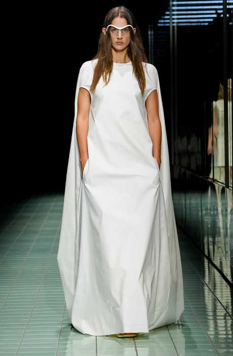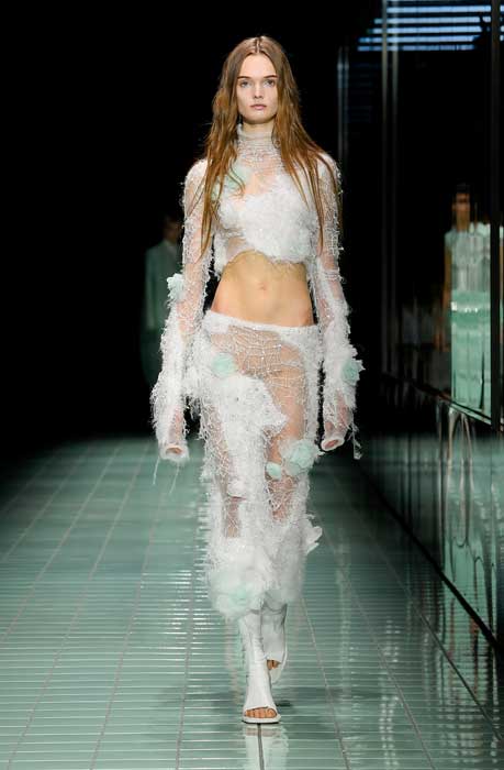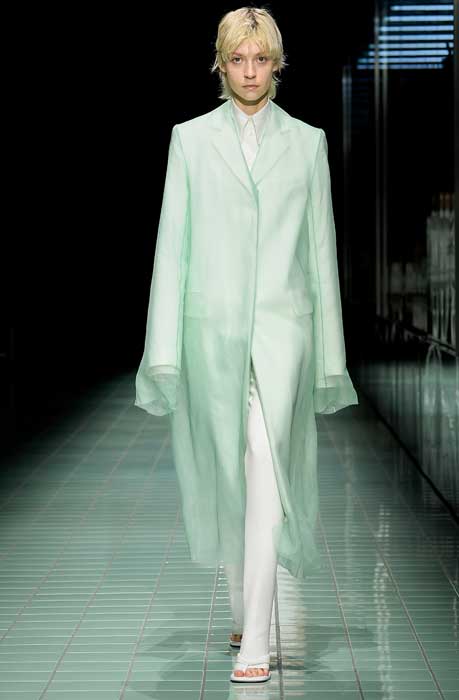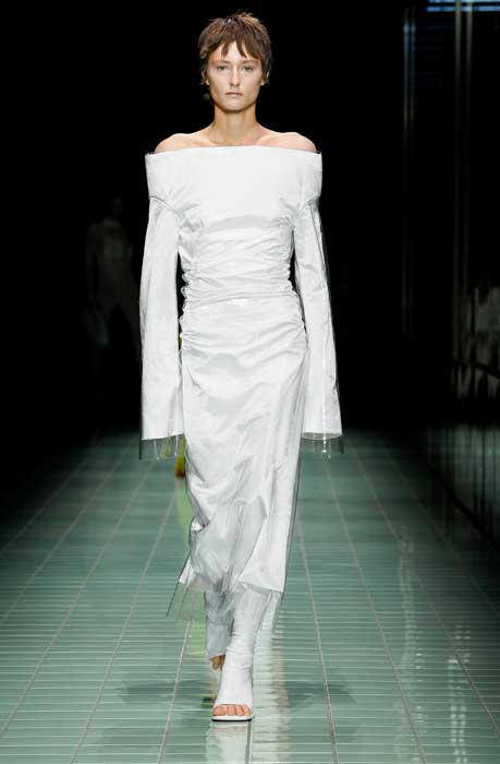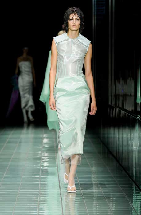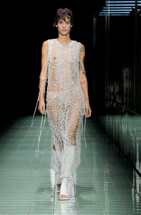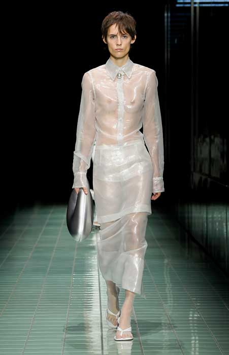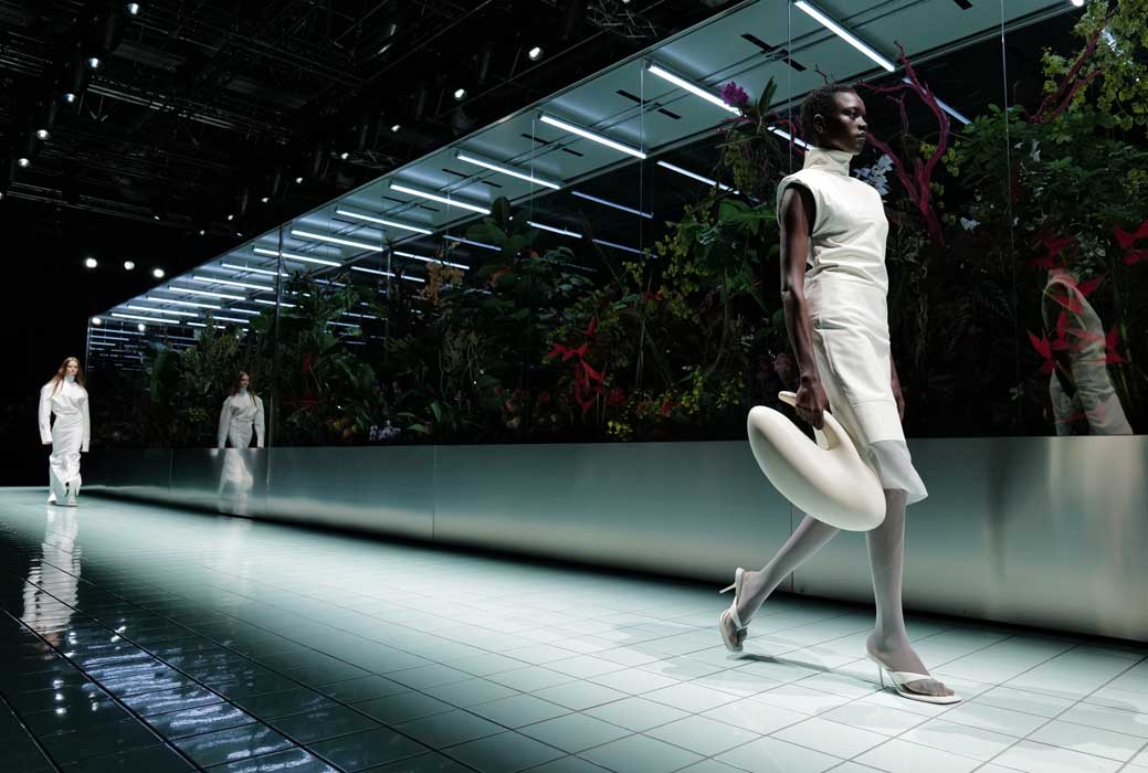 Ma la collezione non si limita a proporre domande. Offre risposte attraverso le sue scelte stilistiche e di design. La palette cromatica, ad esempio, è una celebrazione della natura: verdi botanici, bianchi cristallini, sfumature di cacao intenso e color sterlitzia. Questi colori si manifestano in materiali strutturati e raffinati come raso lucido, PVC, cotoni robusti, lino trattato e fibre di carta compattate. L’uso delle trasparenze evoca l’essenza pura e incontaminata della natura.