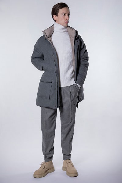 Esclusiva Autunno-Inverno 2024/25 @Pitti Uomo, Stand P/16: Innovativo parka Cortigiani in lana extrafine con dettagli funzionali e imbottitura in piuma d’oca per massimo calore e comfort