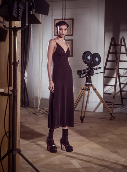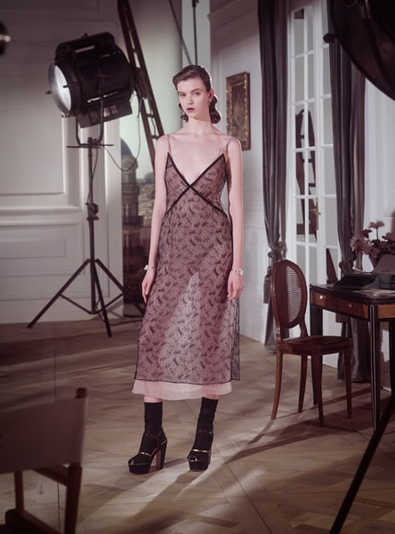 Gli abiti preziosi, a volte leggeri e ispirati allo stile degli anni ’40, lasciano intravedere la lingerie, parte essenziale dell’outfit. Materiali come raso martellato, velluto schiacciato e crepe sono reinterpretati in chiave moderna. Alcuni abiti sottoveste in pizzo, spesso abbinati a grandi cappotti trapuntati con il motivo cannage, evocano i codici distintivi di Dior: stella, mughetto, trifoglio e ape. I colletti in pizzo diventano intarsi strutturali. La maglieria, infine, esprime un’inventiva straordinaria, offrendo una gamma di possibilità che celebra l’incontro tra culture e una conversazione sulla libertà, dando forma e sostanza alle scelte di ogni donna.