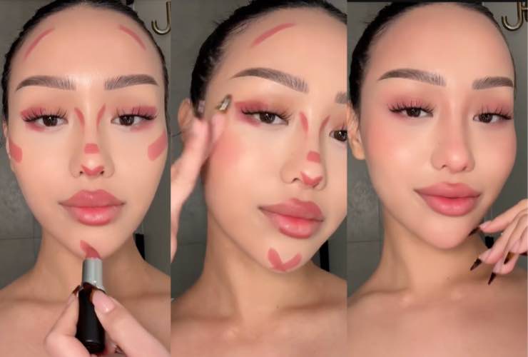 Come si vede nel filmato apparso su Tik Tok (condiviso dall’account @taontm), basta un rossetto per ottenere un contour dal risultato professionale. Questa tecnica prevede l’utilizzo di un lipstick dal colore rosato, da applicare nelle zone strategiche del viso come la fronte, il naso, gli zigomi, le labbra e il mento. Più nello specifico, il rossetto va messo ai lati della fronte, sulla punta del naso, nella parte alta degli zigomi, sull’arco di cupido e al centro del mento.