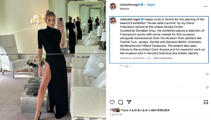 L’influencer più famosa è tornata, anche se posta storie di rado. Una di queste ha fatto parlare molto di sé per un dettaglio che ha conquistato soprattutto il pubblico femminile. L’influencer si è mostrata davanti allo specchio, non quello dell’attico di City Life a Milano ma di un hotel di lusso. Poi ha girato Venezia per l’esibizione “Musei delle Lacrime” di un suo amico Francesco Vezzoli, nel Museo Correr, come ha specificato lei sui social.