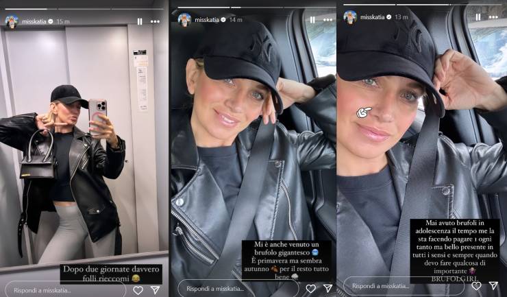 Tipico selfie in ascensore e poi in macchina per Katia che ha accompagnato il tutto da un incantevole sorriso, il suo accessorio più bello, e da un outfit quasi totalmente nero. Ciononostante, l’influencer non ha voluto comunque nascondere troppo le sue imperfezioni. “Rieccomi dopo due giorni folli” ha detto l’influencer che ha poi proseguito così: “Mai avuto brufoli ma il tempo me la sta facendo pagare” ha aggiunto la Pedrotti che ha smesso di rinunciare ai suoi follower e soprattutto alla sua ironia.