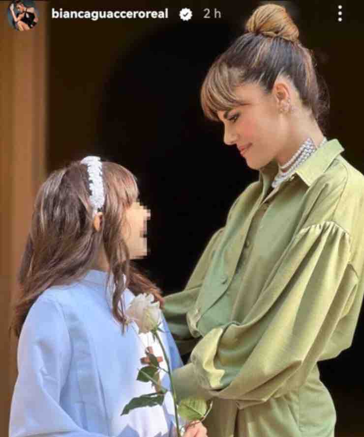 Qualche giorno fa la Guaccero ha festeggiato la prima comunione di sua figlia Alice. La piccola ha 10 anni ed ha ricevuto l’importante sacramento cattolico, come succede a molti suoi coetanei. Per l’occasione, mamma Bianca ha voluto festeggiare insieme alla figlia e alla famiglia, incantando tutti con un outfit tanto semplice quanto d’effetto. La Guaccero, infatti, ha sfoggiato un abito chemisier di gran moda per la stagione primaverile, declinato in una tonalità verde prato che si sposa benissimo con la sua carnagione abbronzata.