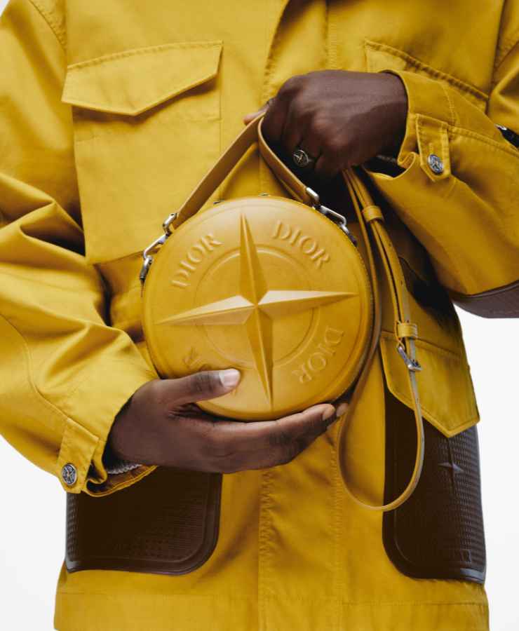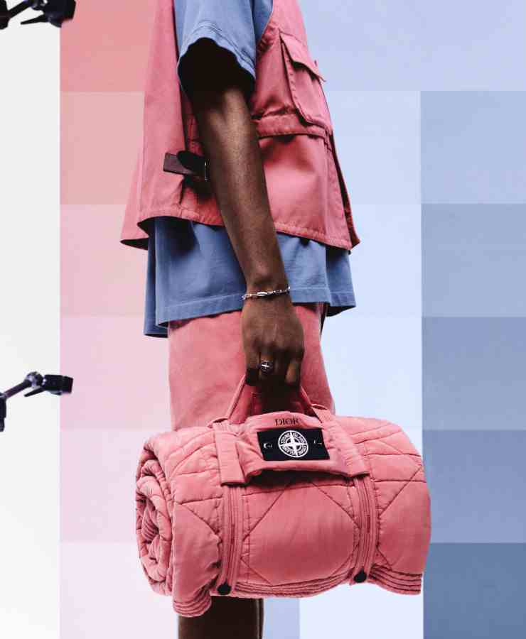 Simboli e dettagli uniscono le due maison. Il motivo sartoriale “doppia piega” di Dior, tratto dalla collezione Haute Couture Primavera Estate 1952, attraversa i capi della capsule. Le strutture interne spesso richiamano il caratteristico sistema “Dutch Rope” di Stone Island, per attaccare e staccare elementi. Elementi iconici di Dior come il Cannage e la Rosa dei Venti di Stone Island compaiono su trapuntature e accessori in pelle. Il logo Dior si posiziona accanto all’iconico badge con bussola di Stone Island, ora in seta e cucito con motivo Cannage.