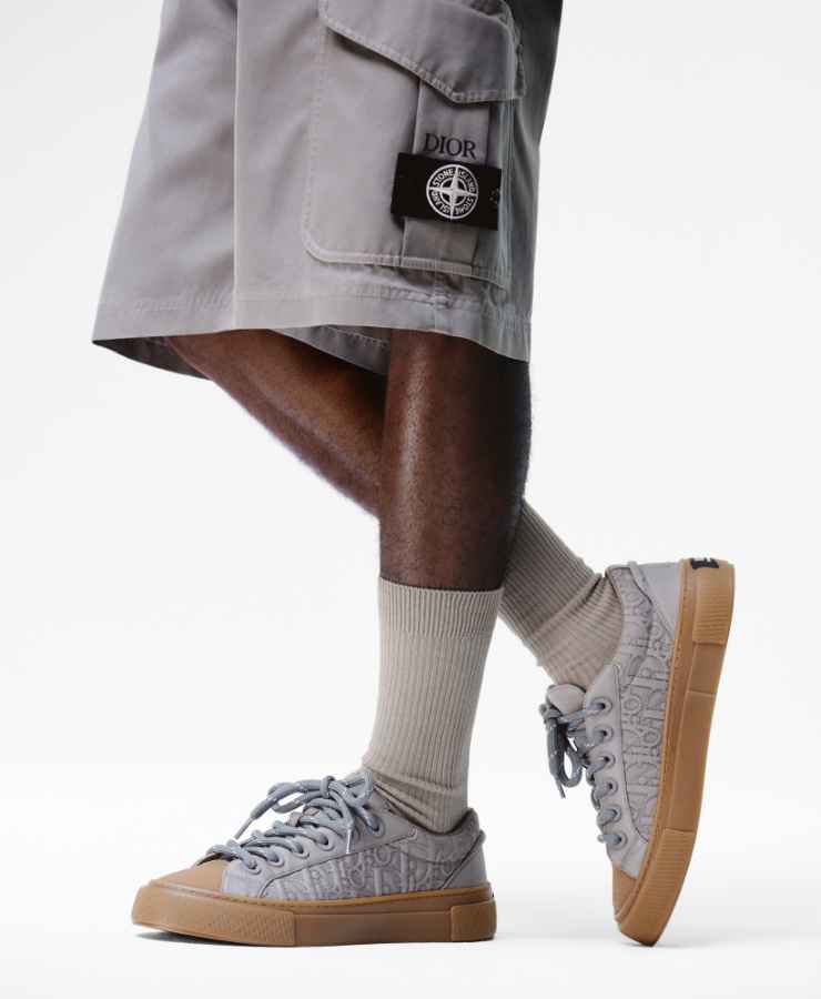 Le calzature sono ibride, un mix di funzionalità e forme classiche. Stivali e derby – elemento iconico di Dior – si ispirano alle costruzioni delle scarpe da climbing e sono dotati di suole spesse realizzate con tre stampi. Le sneakers della capsule collection invece sono realizzate in cotone satinato Stone Island con con cuciture a motivo Oblique di Dior.