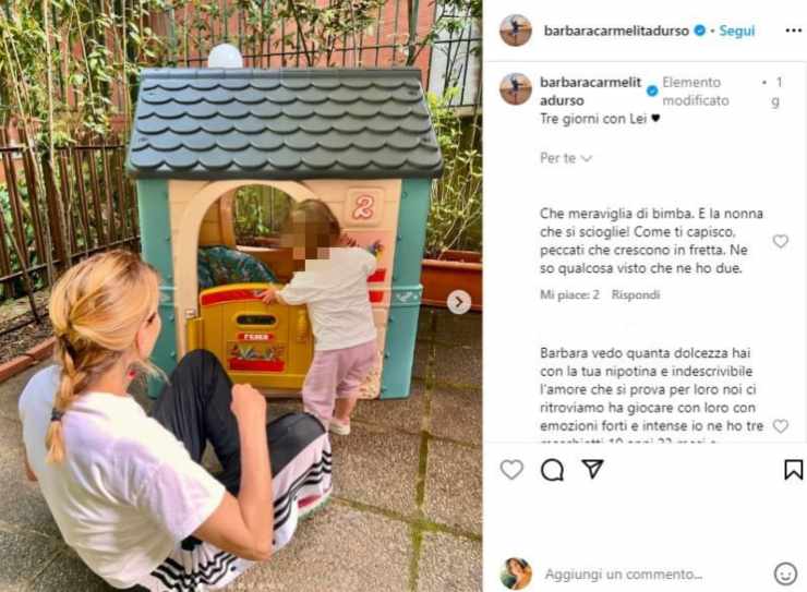 “Che meraviglia di bimba. E la nonna che si scioglie!” ha scritto qualcuno. “Emozione… sei favolosa, Barbara, meravigliosa anche nella veste di nonna” ha aggiunto un altro follower. E ancora: “Brava Barbara” oppure “Meraviglioso vederti così con la tua nipotina”. Non c’è che dire, queste foto sono la dimostrazione che la felicità non sempre si trova in abiti scintillanti ed accessori griffati, ma nella semplicità di un momento vissuto insieme alla propria famiglia. Non siete d’accordo con noi?