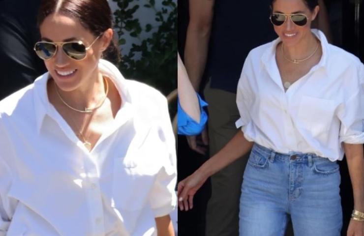 Da lontano può sembrare che sfoggi una semplice camicia bianca e solo un paio di jeans, ma di fatto non è così. Infatti, l’ultimo look di Meghan Markle per quanto essenziale, vale tantissimo. Questo grazie ai gioielli carissimi che indossa: rigorosamente oro come piace a lei, la reale ha sfoggiato una collana di Cartier dal costo di 18 mila euro che ha abbinato a un’altra collana di Ariel Golden, del valore di 2500 euro, sulla quale sono incisi i nomi dei figli Archie e Lilibet. A questo si aggiungono un braccialetto di Cartier da 6 mila euro, un orologio sempre della firma, un tempo appartenente a Lady Diana, da 21 mila euro e un bracciale di diamanti da 18 mila euro: solo con questi gioielli la reale ha addosso 65 mila euro di gioielli ai quali si aggiungo i 200 mila dell’anello di fidanzamento regalatole da Harry, che brilla sul suo dito.