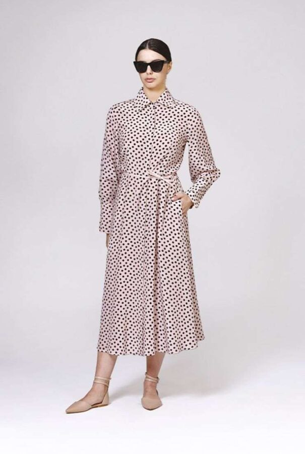 Poi c’è il Brindisi, un altro chemisier in seta, con la stampa a pois che ormai è diventata una firma visiva del marchio. Questo ha le maniche corte, l’elastico in vita, un colletto che si ispira a quello alla coreana e delle tasche che sembrano quasi un dettaglio casuale, ma in realtà fanno tutta la differenza. Costa 800 euro, ed è un abito semplice ma curato, che Cristina porta spesso nei contesti più informali, ma non passa mai inosservato. Ha quella qualità strana di farti sentire ordinata anche quando sei in ritardo o non hai dormito benissimo. Non capita con tutti i vestiti, ma con questo sì.