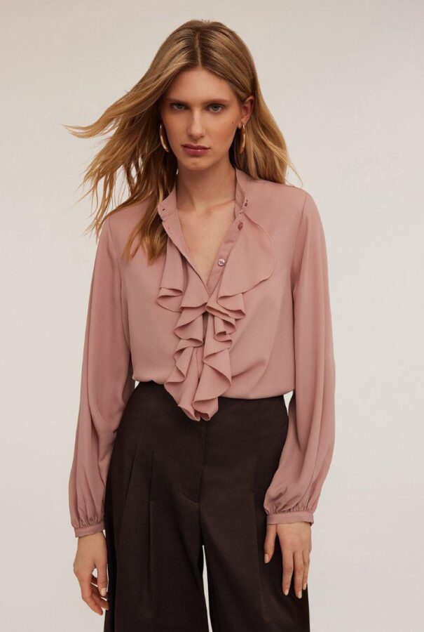 Poi c’è lei, la rosa di Motivi. Qui siamo da un’altra parte, più vicina al romanticismo, ma sempre con i piedi per terra. Le ruches sono più decise, seguono il taglio centrale e danno forma, senza creare ingombro. Il colletto alla coreana è una bella mossa: non interrompe la linea, non costringe, ma dà quel tocco ordinato che regala subito un’aria più composta. I bottoni a vista, semplici ma eleganti, aiutano a tenere tutto sotto controllo, anche se la stoffa è leggera. È un crêpe tinta unita che cade bene, non si appiccica, non si stropiccia troppo. Costa poco più di 70 euro, ed è la classica camicia che ti salva la giornata quando non sai cosa mettere per un appuntamento, un pranzo di lavoro, o anche solo per sentirti più curata, ma senza esagerare.