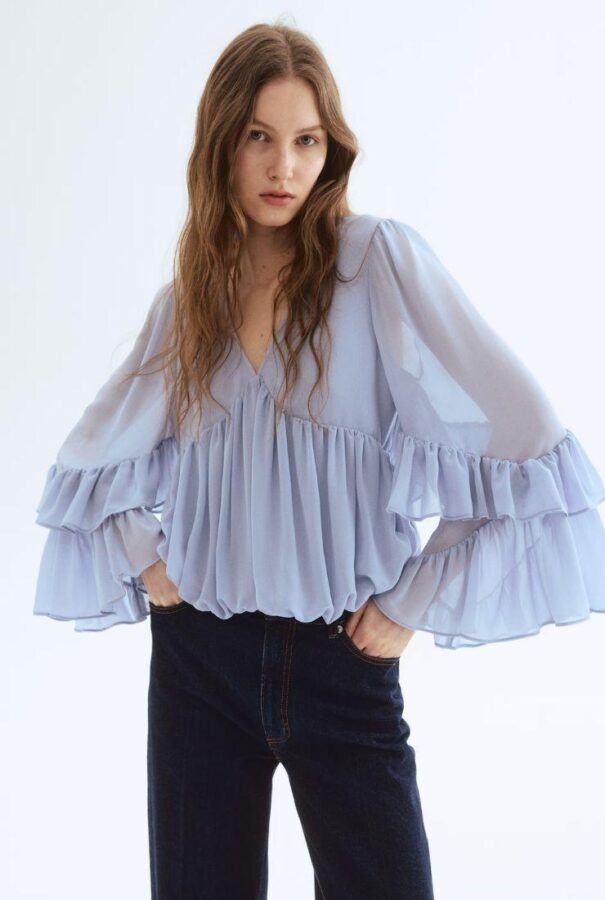 Infine arriva quella più teatrale, quella che potremmo immaginare addosso a un personaggio di un film in costume che però ha il telefono in mano e sta aspettando l’autobus: la camicetta in chiffon di H&M, azzurra, ampia, vaporosa. È fatta in chiffon increspato, che già da solo basta a dare movimento. Ma poi ci sono i volant sulle maniche lunghe, larghi, morbidi, che scendono con un effetto quasi nuvola. La cucitura sotto il seno aiuta a dare una forma, quindi non è solo larga, è pensata per accompagnare.
