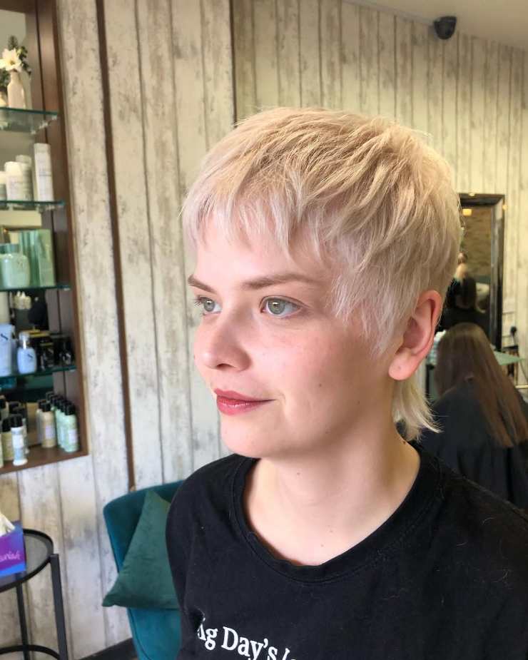 Se vuoi invece darci un taglio ma non rinunciare del tutto a un po’ di lunghezze, ti consigliamo di puntare sul tinkerbell medio asimmetrico, quindi lasciare sino a 10 cm di capelli e oltre, giocando però con intrecci, volumi, sfrangiati e giochi di styling. Ad esempio in questo biondo che ti mostriamo puoi notare come il corto della chioma risulti comunque gradevole e con effetto ‘lunghezza‘.
