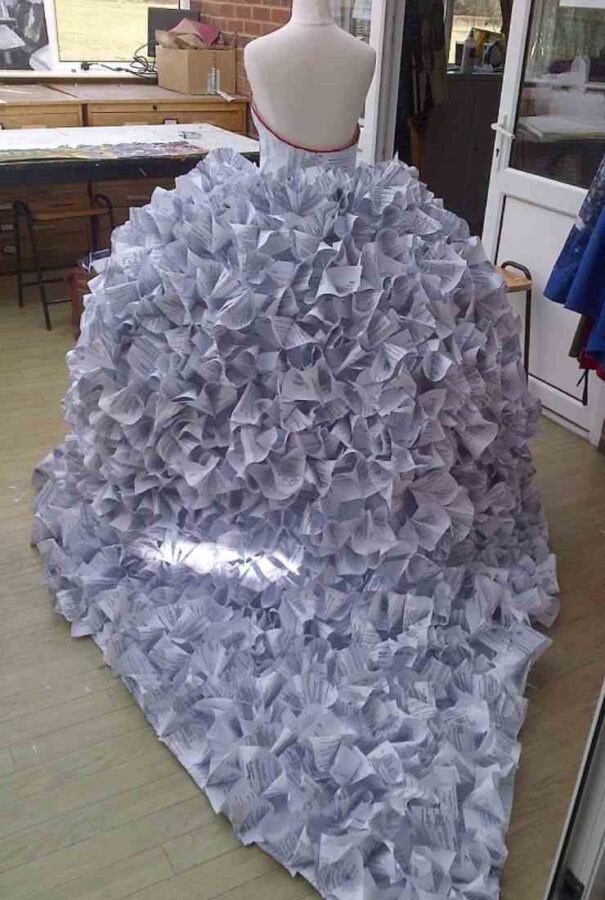Anche la scelta del materiale è tutto tranne che casuale. Inizialmente aveva pensato a delle riviste, ma poi è arrivata l’intuizione: usare qualcosa che non fosse solo simbolico, ma reale. Fogli veri, documenti legali, graffettati uno ad uno su una struttura in filo metallico. Il risultato ricorda certi abiti teatrali visti nelle sfilate più eccentriche o nei programmi come Il Castello delle cerimonie. Ma qui non c’è solo estetica. C’è un messaggio e c’è una ragazza che ha deciso di parlare di matrimonio, ma a modo suo.