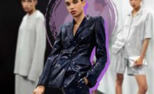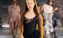 I costumi sono immersi in paillettes e luce, e abbinati a lussuosi trench in organza nera ricamata o in vinile trasparente comunicano una modestia carica d’ironia.