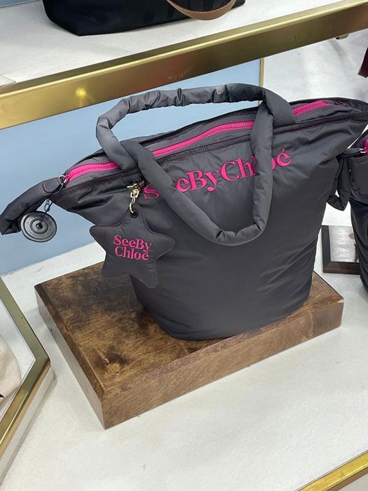 Chloè abbina il magenta al grigio fumo della borsa in tessuto. Un mix perfetto che da leggerezza e personalità anche alla più semplice (ma anche incredibilmente comoda…) delle borse.