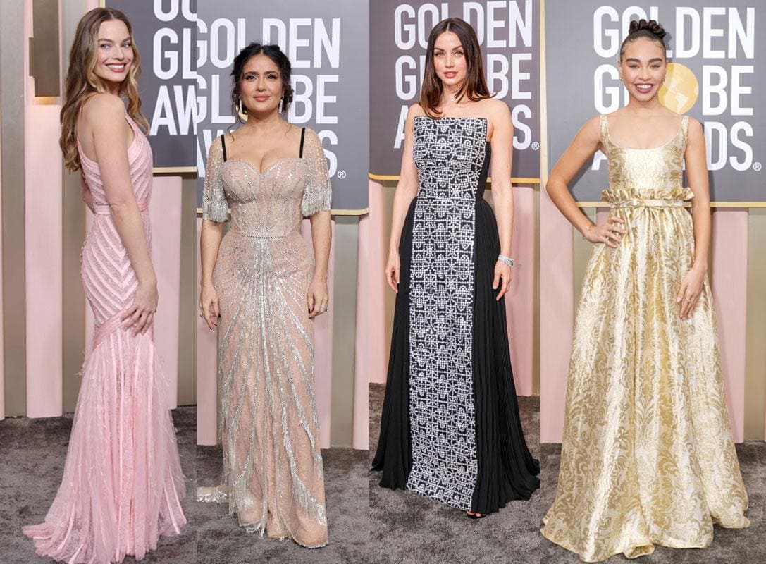 Salma Hayek Pinault, che ha presentato l’evento, ha indossato un abito lungo custom made rosa cipria, interamente ricamato in cristalli, con dettaglio di frange, clutch Dyonisus e sandali a tacco alto aperti in punta. Look Gucci @Press OfficeBailey Bass è un raggio di sole con il suo elegantissimo abito in broccato d’oro in seta ( collezione PE 2023 di Dior by Maria Grazia Chiuri). La sua mise è completata da un bracciale Rose Des Vents e anello in oro giallo, diamanti e madreperla della gioielleria Dior, e orecchini Gem Dior in oro giallo e diamanti.Uno spettacolare abito da ballo in faille e moiré rosso fuoco con tanto di bustier drappeggiato per Lily James. L’attrice punta sulla sartorialità di Atelier Versace e incanta con una gonna scultorea e voluminosa che si ispira ai modelli d’archivio della Maison. @Press OfficeMichelle Williams, che ha ricevuto una nomination come Migliore Attrice in un film drammatico per la sua interpretazione in “The Fabelmans”, ha indossato un abito lungo custom made monospalla color avorio, con maxi ruches asimmetriche e profili in perline, sandali con platform a tacco alto in pelle metal. Look Gucci @Press OfficeDiego Calva, che ha ricevuto una nomination come Miglior Attore in un film comico o musical per la sua interpretazione in “Babylon”, ha indossato un completo tre pezzi verde scuro con giacca a due bottoni, gilet, camicia bianca, papillon in velluto nero, spilla fiore in organza avorio, booties in pelle nera. Look Gucci. @Press OfficeMark Foster ha indossato un tuxedo nero con giacca con revers a lancia, camicia bianca, papillon in raso nero e mocassini in vernice nera di Gucci. Press OfficeElizabeth Debicki ha sfoggiato un abito in seta rosa senza spalline di di Dior by Maria Grazia Chiuri. A rendere il tutto ancora più prezioso? La collana Rose Dior Bagatelle in oro bianco e diamanti della gioielleria Dior. Trucco curato dal team Dior Beauty @Press OfficePer Barry Keoghan un sofisticato abito custom made celeste, con doppiopetto crop abbinato ad una camicia con colletto annodato e un paio di eleganti Derby shoes nere, entrambi firmati Louis Vuitton. @Press OfficeMargot Robbie romantica in rosa chiaro con il suo abito ispirato al look 41 della collezione Haute Couture Autunno-Inverno 2022/23. Scarpe CHANEL. La creazione di questo abito ha richiesto 750 ore di lavoro e circa 30 000 elementi di ricamo. Gioielli di Alta Gioielleria CHANEL @Press OfficeAnya Taylor-Joy ha indossato un top e una gonna in seta gialla della Pre-Fall 2023 di Dior by Maria Grazia Chiuri. Trucco curato dal team Dior Beauty. @Press officeJay Ellis è impeccabile con un elegante smoking in velluto nero, impreziosito da dettagli in raso e completato da scarpe nere in vernice firmate Louis Vuitton. @Press OfficeJenna Ortega, che ha ricevuto una nomination come Miglior Attrice protagonista in una serie comica o musical per la sua interpretazione in “Wednesday”, ha indossato un abito lungo in chiffon plissé con strascico e dettagli cut out. Look Gucci Press Office