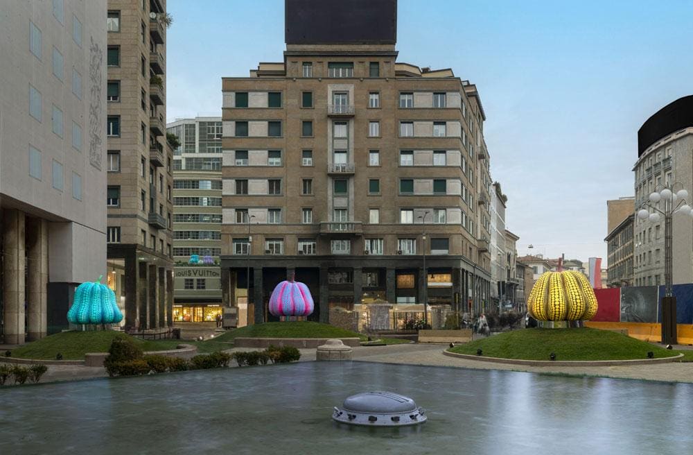 Installazioni ispirate all’arte di Yayoi Kusama in piazza San Babila, dal 13 gennaio al 14 febbraio 2023.