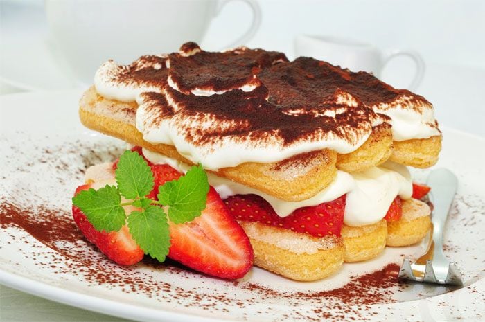 Sostituisci il caffè con un purea di fragole e aggiungi fragole fresche tagliate a pezzetti nella crema al mascarpone.