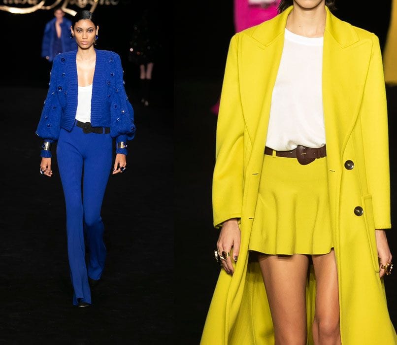 La collezione si caratterizza per il dialogo tra forza e delicatezza, coraggio e garbo, e così i capispalla imponenti, come lunghi cappotti double con spalle importanti e revers generosi, diventano l’accento sulla forza delle donne, proposti in monocolore, in pelliccia sintetica a motivo leopardo o ricoperti di micro-paillettes, abbinati a minigonne a tulipano e gonne pencil con spacchi laterali vertiginosi e T-shirt o canottiere in viscosa trasparente. I montoni oversize e le pellicce sintetiche con colli voluminosi rappresentano audaci alternative al cappotto di stagione.
