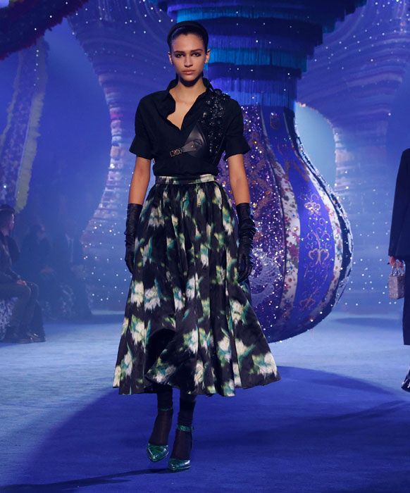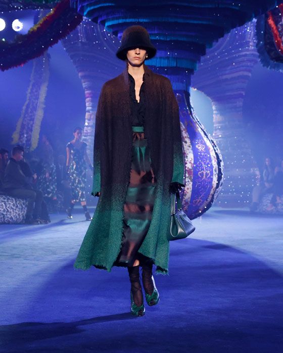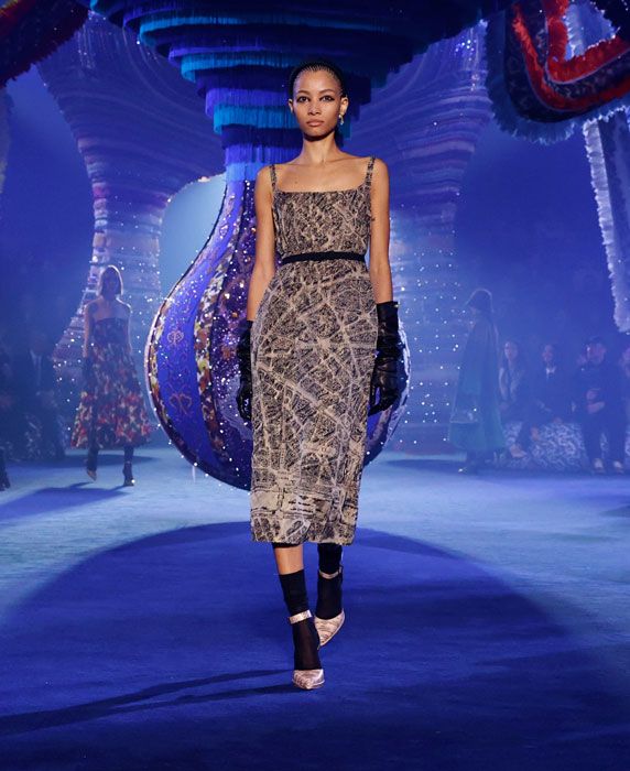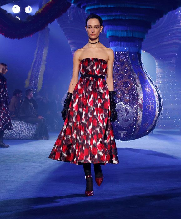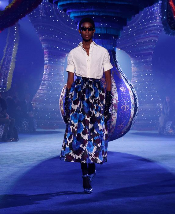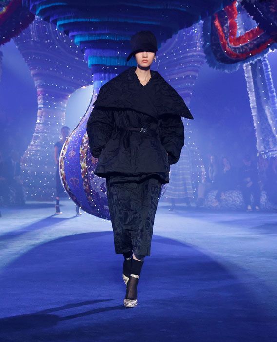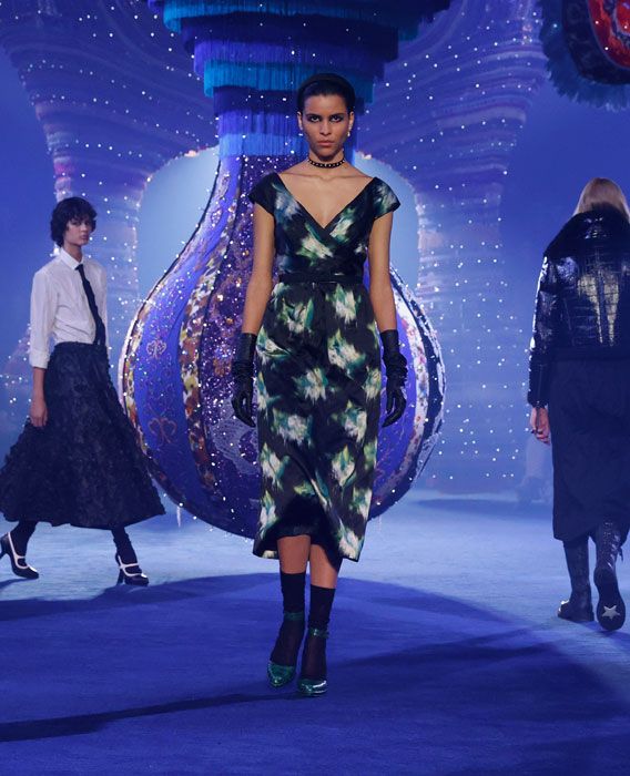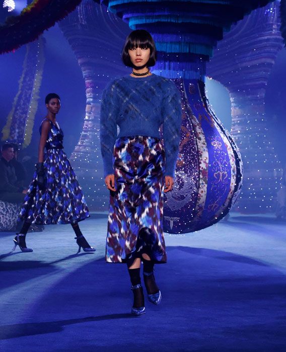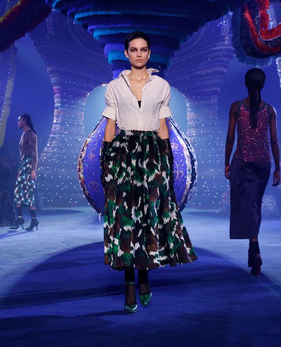 Le tradizioni tessili conservano, nel futuro, il ricordo del loro passato, possiedono un’intelligenza pervasiva. Joana Vasconcelos di solito lavora con tessuti che evocano una memoria di origini e la forza dell’artigianato per lei. Per il défilé di Dior, ha scelto di utilizzare tessuti floreali ispirati agli archivi della Maison, un omaggio ai fiori di Miss Dior e allo splendore della natura così cara al couturier fondatore, collegando così luoghi, tempi e culture. Joana Vasconcelos riattiva, attraverso le emozioni, la bellezza intrinseca e l’intreccio costantemente rinnovato di femminilità e femminismo che permea il suo lavoro così come quello di Maria Grazia Chiuri.