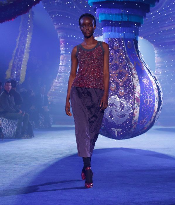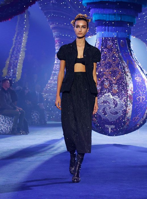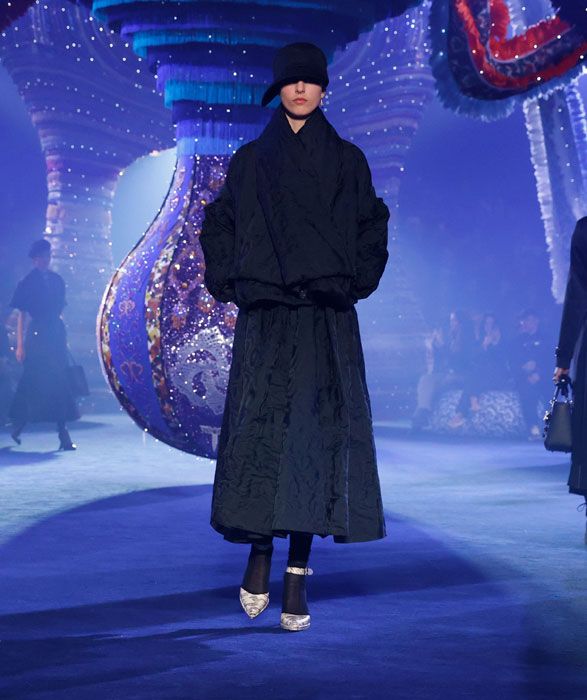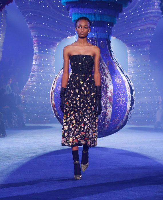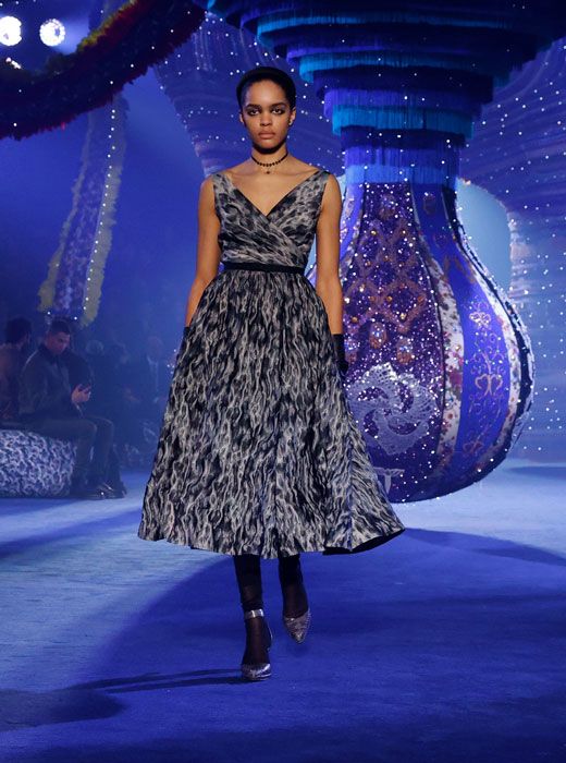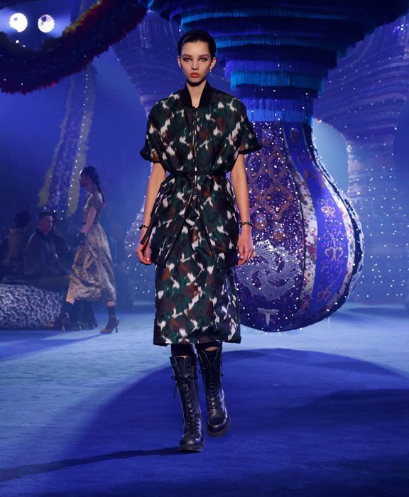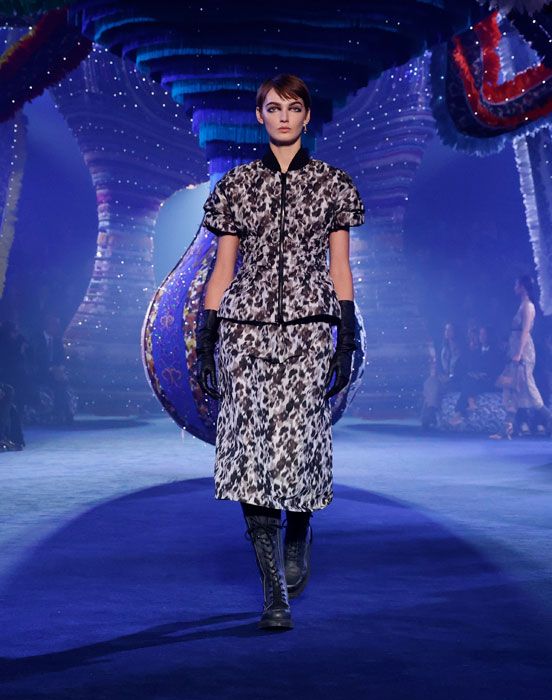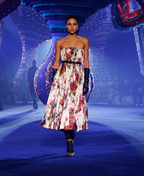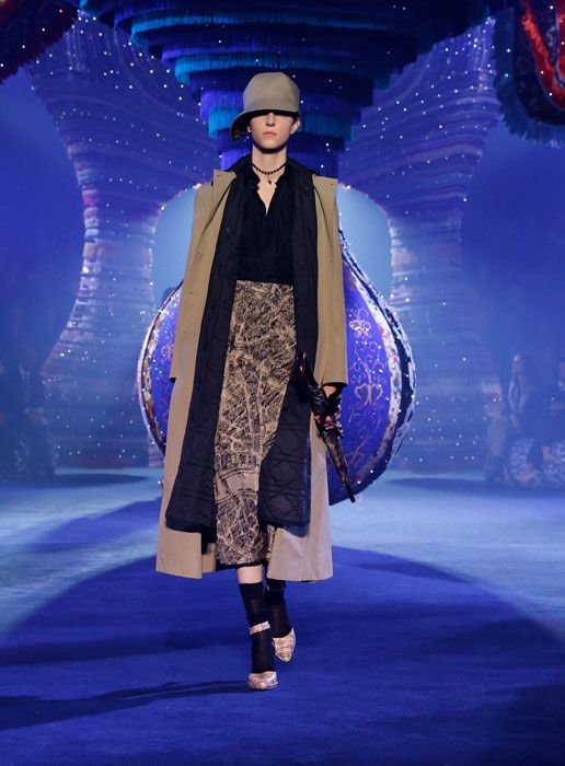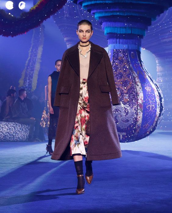 Le tradizioni tessili conservano, nel futuro, il ricordo del loro passato, possiedono un’intelligenza pervasiva. Joana Vasconcelos di solito lavora con tessuti che evocano una memoria di origini e la forza dell’artigianato per lei. Per il défilé di Dior, ha scelto di utilizzare tessuti floreali ispirati agli archivi della Maison, un omaggio ai fiori di Miss Dior e allo splendore della natura così cara al couturier fondatore, collegando così luoghi, tempi e culture. Joana Vasconcelos riattiva, attraverso le emozioni, la bellezza intrinseca e l’intreccio costantemente rinnovato di femminilità e femminismo che permea il suo lavoro così come quello di Maria Grazia Chiuri.