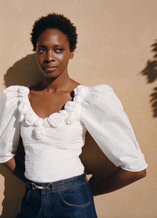 Il denim scuro o nero viene proposto in un tessuto fluido a contrasto con bluse bianche con fiocco, maniche a sbuffo, colletti froufrou o dettagli che ricordano la lingerie. Gli abiti sono caratterizzati da stampe floreali e dettagli come spalle imbottite e maniche farfalla.