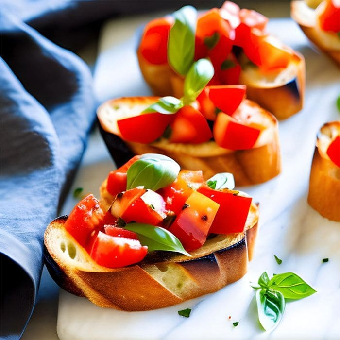 Bruschette al pomodoro e basilico, un classico intramontabile. Pane abbrustolito condito con un trito fresco di pomodorini, basilico, olio EVO, sale e pepe. Semplici ma sfiziose, perfette per un aperitivo con gli amici.