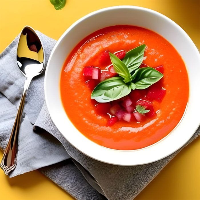 Come primo, non c’è niente di meglio di un bel gazpacho, la zuppa fredda di pomodoro. La nostra versione speciale prevede pomodori, cetrioli, peperoni rossi e pane raffermo, per un risultato cremoso e saporito.