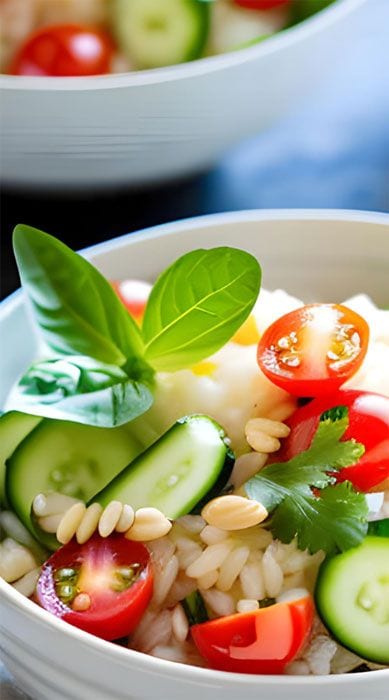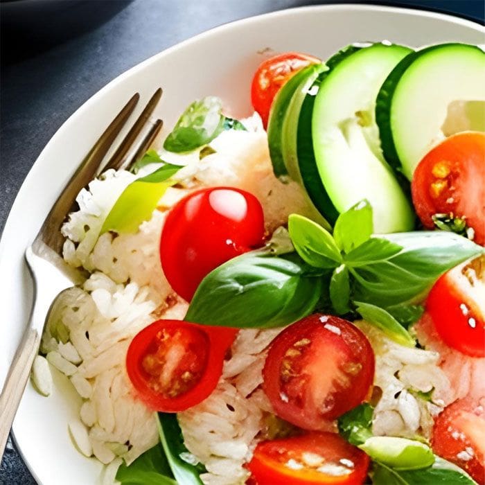 Per cominciare, una gustosa insalata di riso fredda, arricchita con pomodorini, cetrioli, tonno e basilico. Nutriente ma leggera, è l’ideale per una cena estiva.