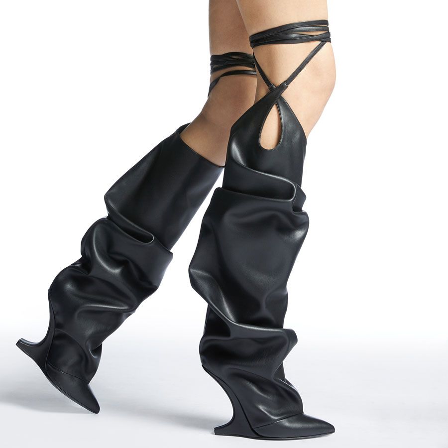 Infine, gli stivali “Andra“, dal nome greco che simboleggia forza e coraggio, sono realizzati in morbidi pellami che drappeggiano il gambale e si cingono attorno alla coscia, rappresentando perfettamente la cifra estetica del nuovo brand.
