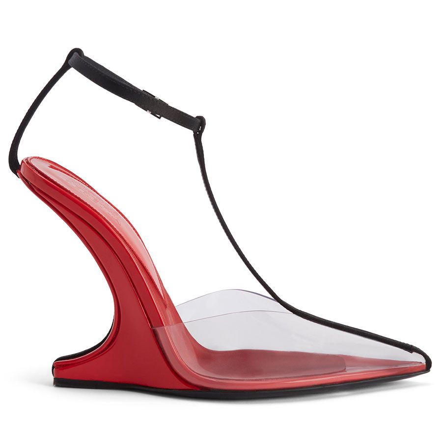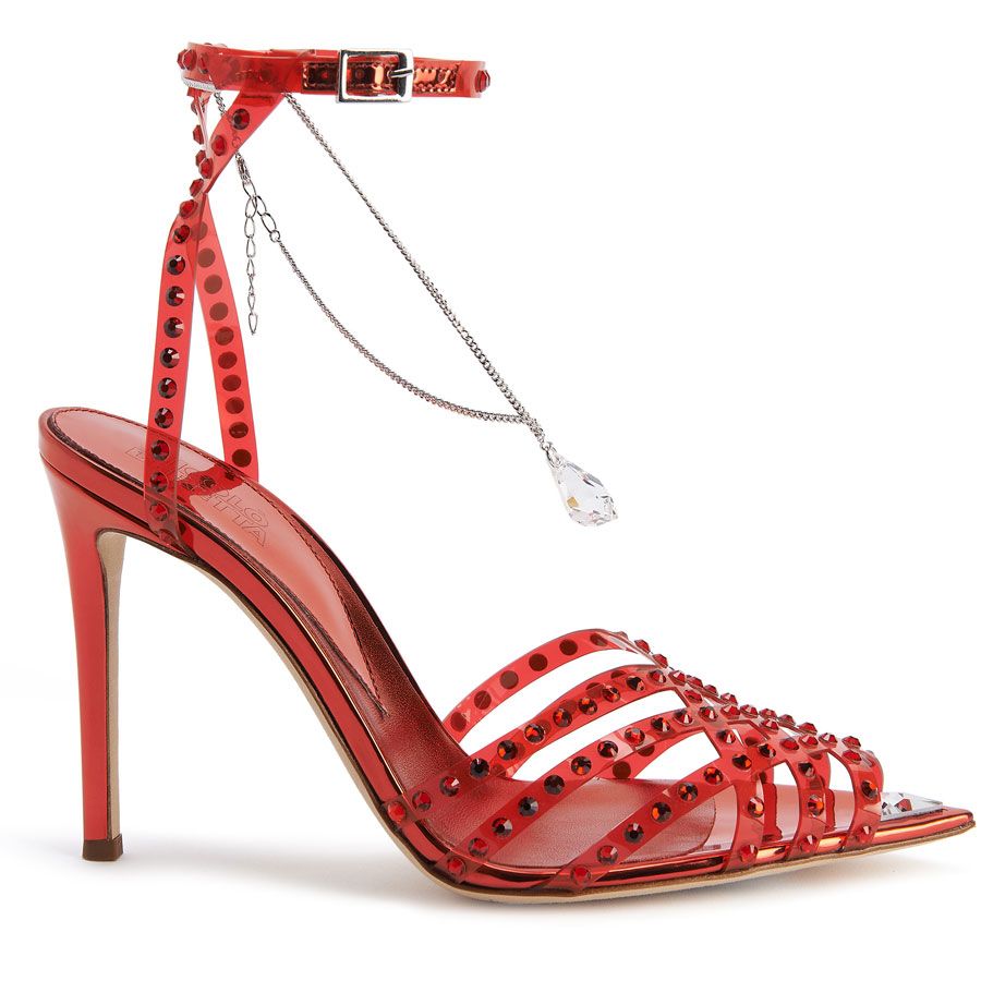 La palette cromatica richiama le installazioni luminose di Dan Flavin e vibra di tonalità accese di arancione, fucsia e rosso, mescolate a sfumature metalliche dorate e argentee. Le texture riflettenti e le trasparenze dei sandali “Revenge”, punteggiati da micro-cristalli che ne sottolineano la silhouette, contrastano l’effetto opaco dei tessuti gommati dal vibe futuristico, ma anche giocoso, nelle ballerine spuntate con l’iconico cristallo triangolare in punta.