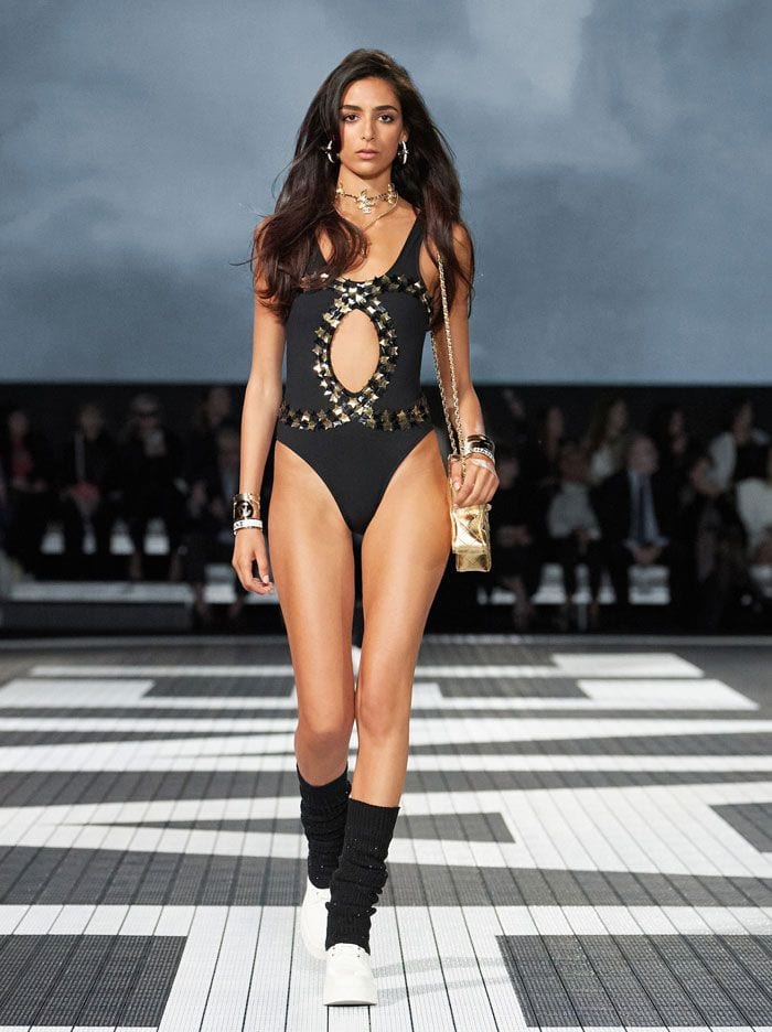 Il tocco artistico di André, i cui poster bicolore adornano le mura della Città degli Angeli, e la fotografia di Inez & Vinoodh, si uniscono alla creatività di Virginie Viard per dare vita a una proposta dannatamente cool. L’attrice Alma Jodorowsky, ambasciatrice Chanel, incarna l’essenza di questa collezione, una fusione tra lo sporty chic e il glamour, pratica ed elegante, con top mini e shorts in maglia pastello, bikini gioiello tempestati di pietre e shorts a vita alta.