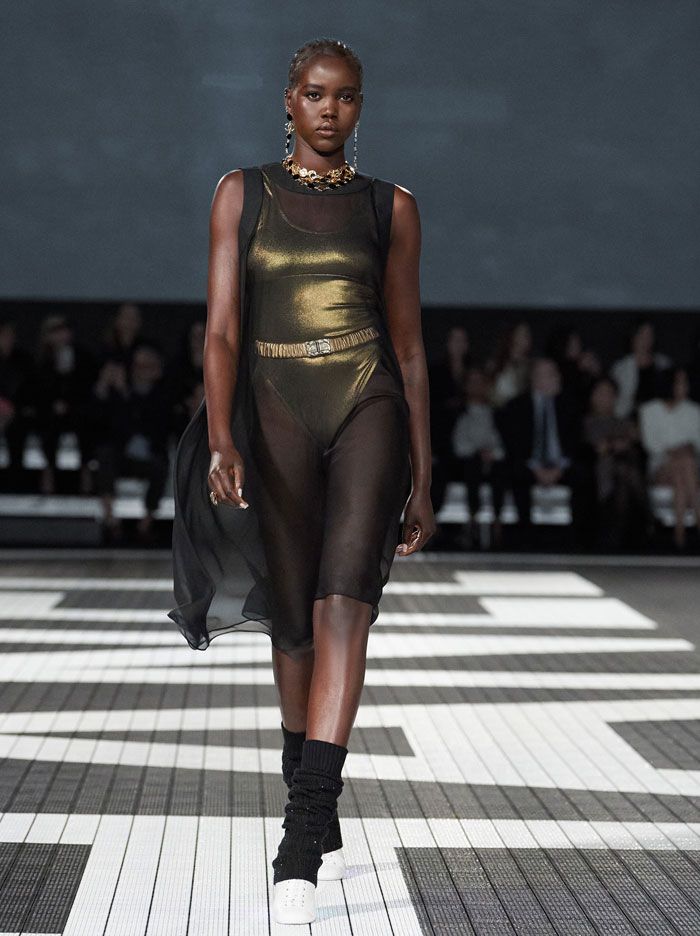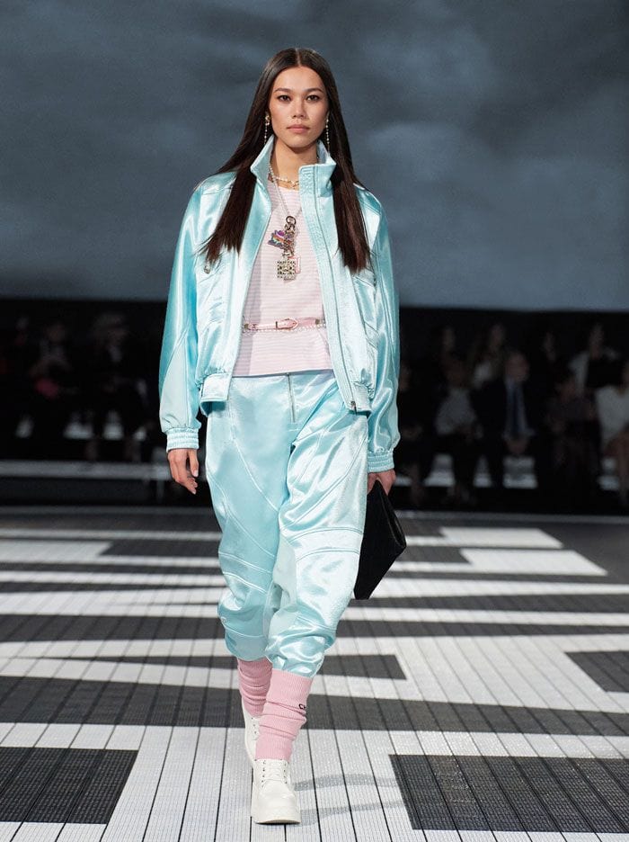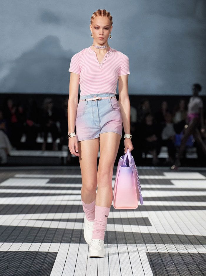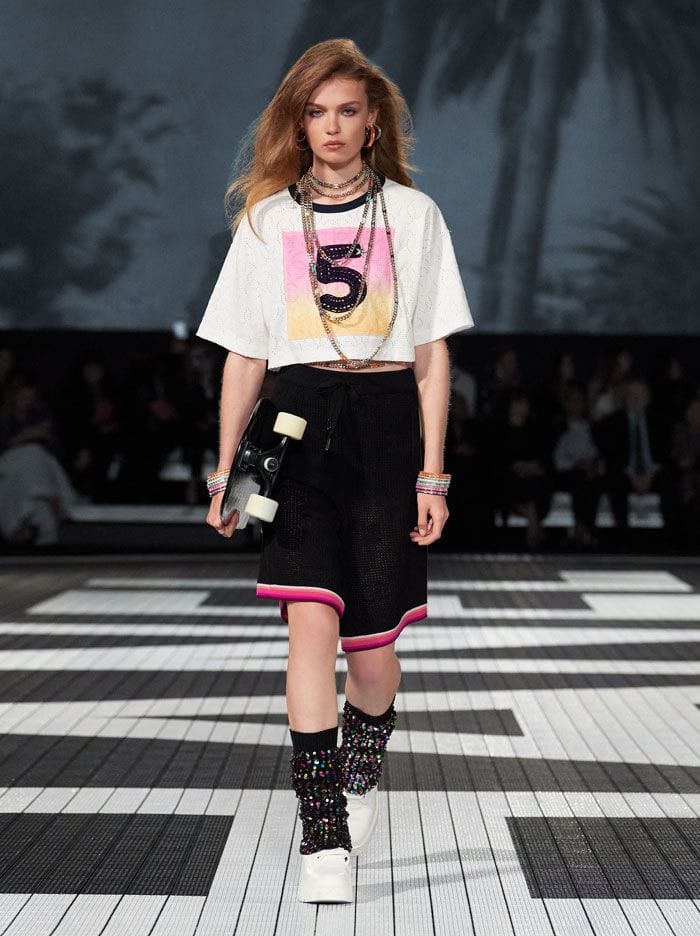 Le t-shirt cropped con il numero 5, gli scaldamuscoli scintillanti e gli skateboard incarnano l’energia sportiva e l’atmosfera effervescente di Venice Beach. Al calar della sera, trionfano gli abiti tempestati di lustrini e paillettes, pronti a farci risplendere come le star di Hollywood, insieme a gonne raffinate, perfette da abbinare a un top sofisticato per un look disinvolto ma di assoluta eleganza.