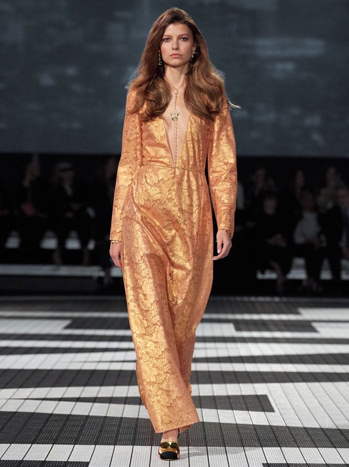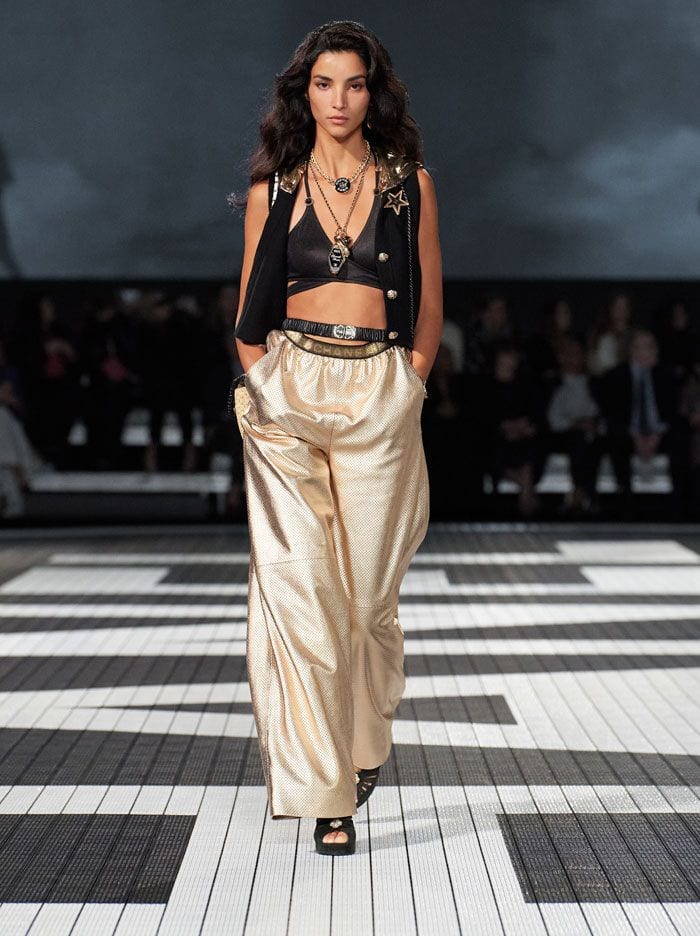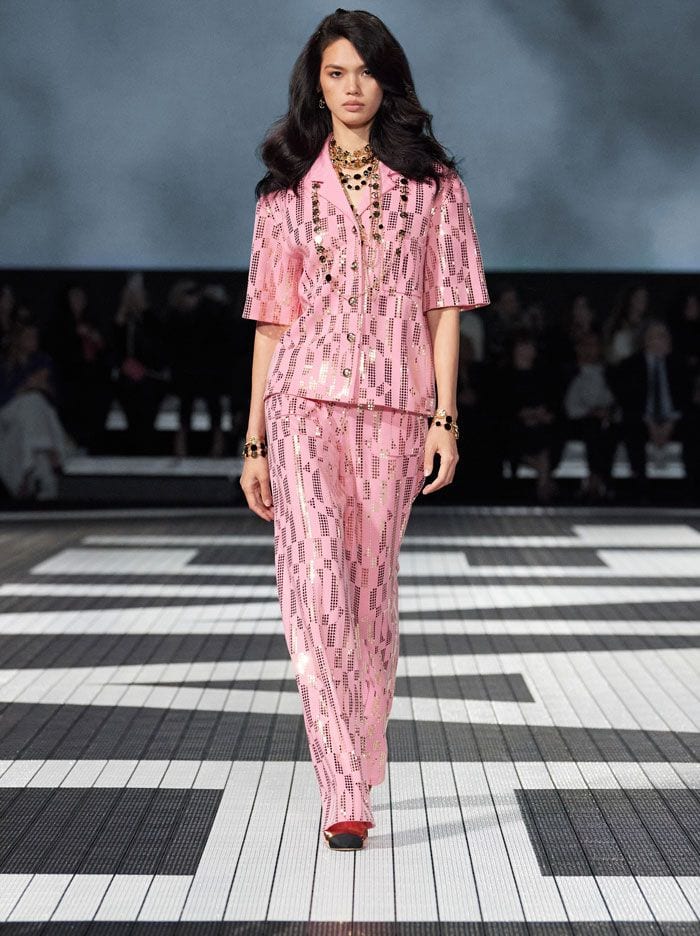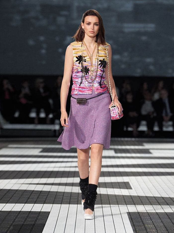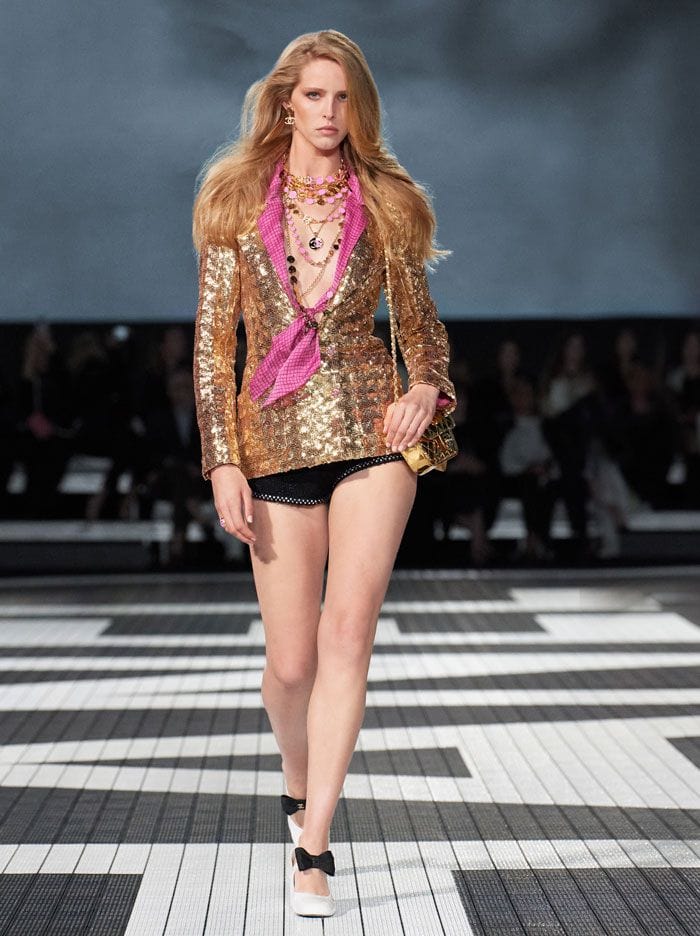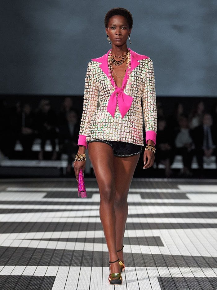 La collezione Cruise è sempre stata legata all’immaginario del viaggio e Los Angeles, culla dell’arte, dello spettacolo e dell’avanguardia, si rivela come la location ideale per la sfilata e un parterre ricco di vip e star. La palette è viva: colori sgargianti e riflessi metallizzati dominano la passerella, intersecandosi con i codici distintivi tanto cari a Mademoiselle Chanel – fiocchi, perle, tweed e, naturalmente, l’iconica C.