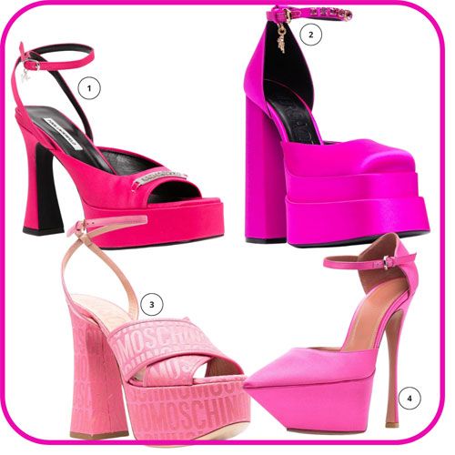 1- Karl Lagerfeld – Lazula 120mm logo-engraved sandals ; 2– Versace – Medusa Head charm platform sandals ; 3– Moschino – 145mm logo-print platform sandals ; 4- Amina Muaddi – Angelica 150mm pumps ;