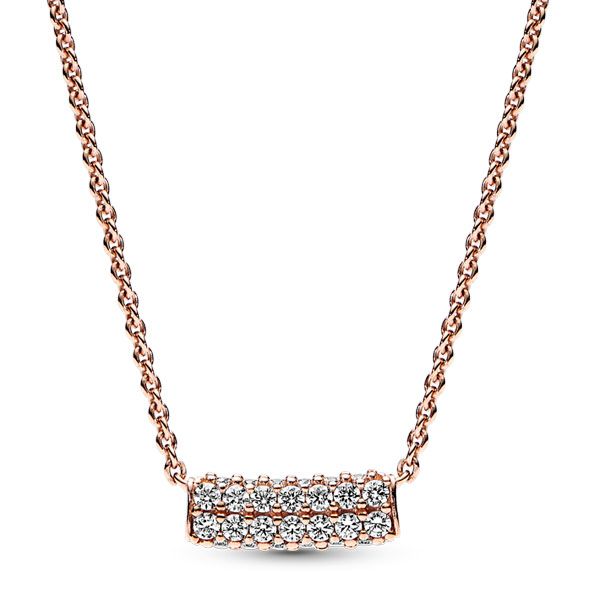 A chiudere il trio ecco la Collana Pavé Fascia Doppia, gioiello versatile dall’allure chic. Una barra centrale con doppie file di pavé è il cuore luminoso di questa creazione, arricchita da ulteriori file di pavé ai lati. Lunghezza regolabile per adattarsi a ogni mise, da indossare da sola o abbinata agli orecchini e all’anello per una luce senza pari.