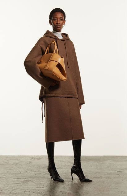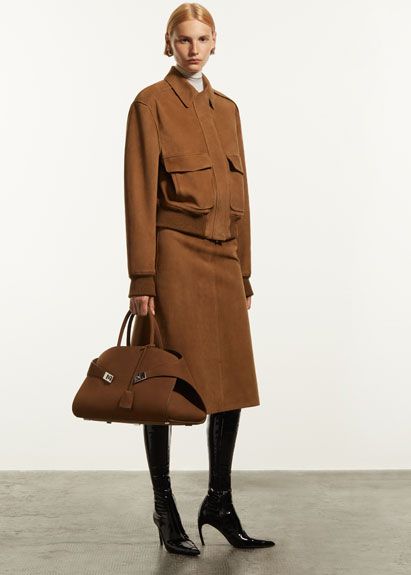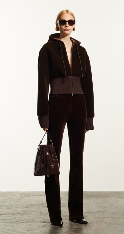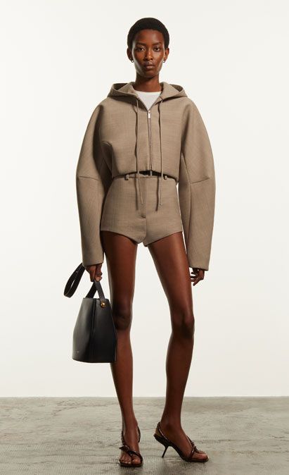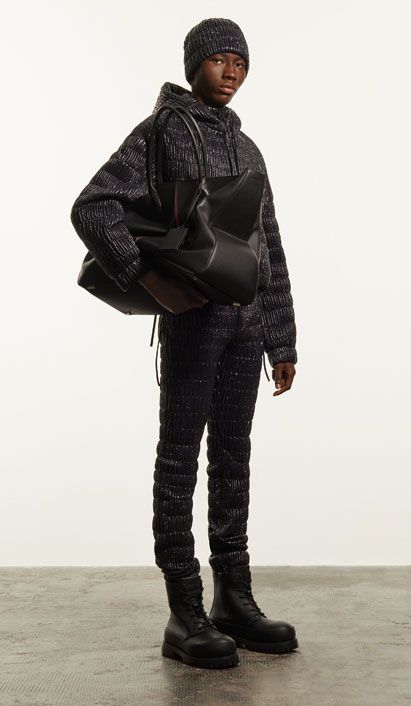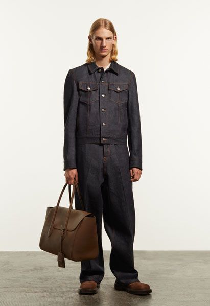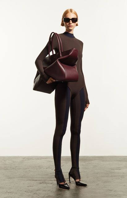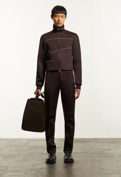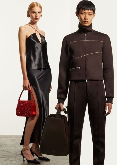 I richiami all’archivio Ferragamo sono presenti ovunque: nel dettaglio di un torchon metallico ripreso da una scarpa del 1956, nella fibbia metallica ispirata a un accendino Ferragamo di una collezione lifestyle degli anni ’80, e nelle sagome trapuntate che rimandano a una sfilata del 1999. L’eredità convive con il linguaggio distintivo di Davis, espresso sia nelle linee delle tute sportive che nelle silhouette anni ’50 dei micro-bomber couture.