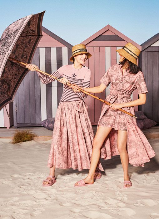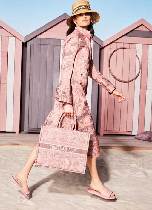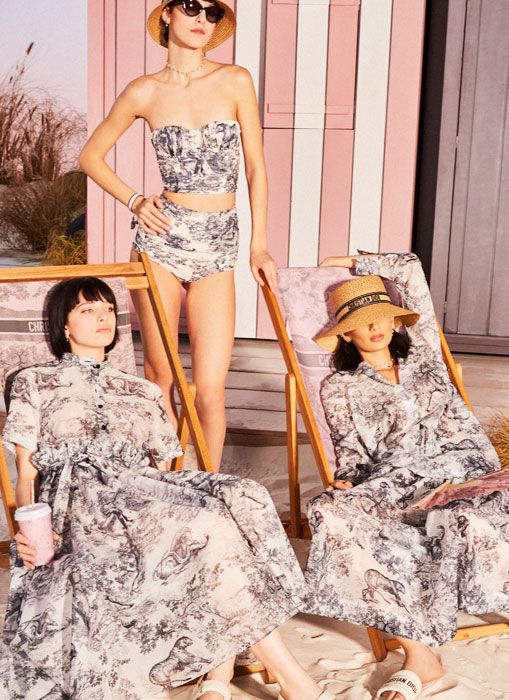 Jupes, robes, shorts, maillots de bain: la Toile de Jouy Sauvage abbraccia ogni capo e si racconta in rosa e grigio, colori cari a Monsieur Dior. Ma non finisce qui! Foulards, borse Lady Dior e Dior Book Tote, mules Dway, escarpins J’Adior: ogni accessorio è un tuffo nel glamour.