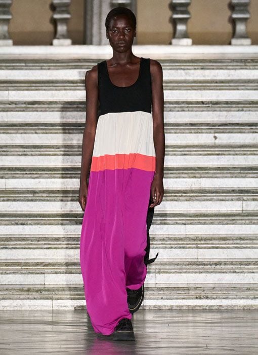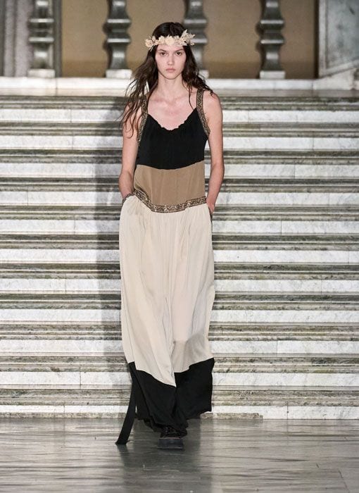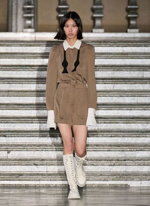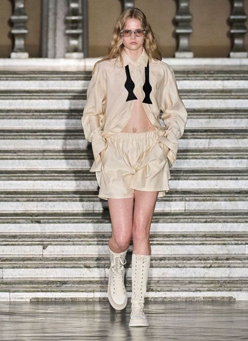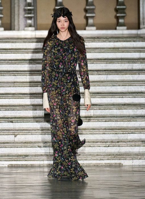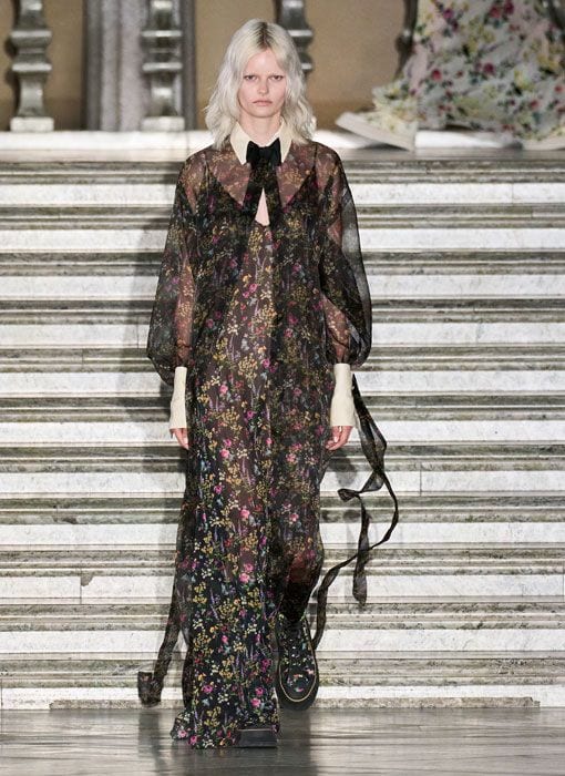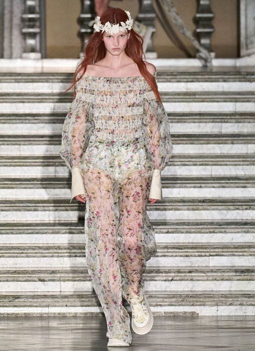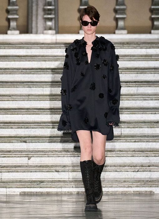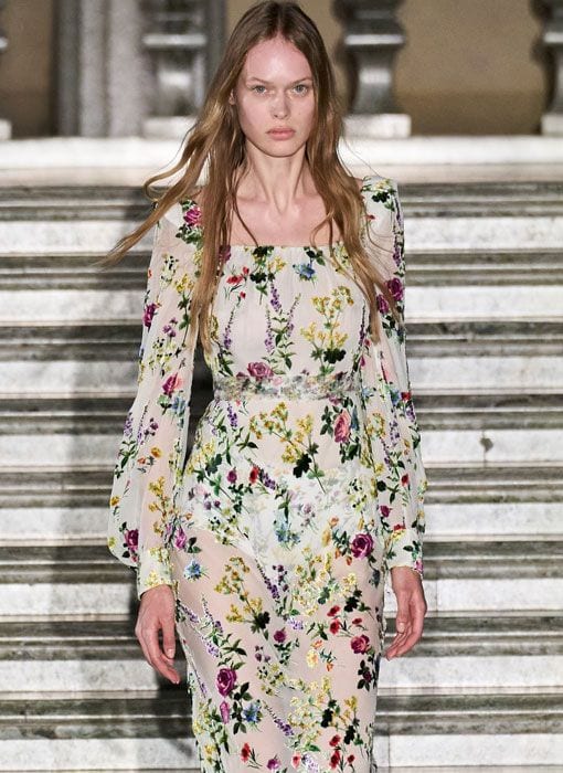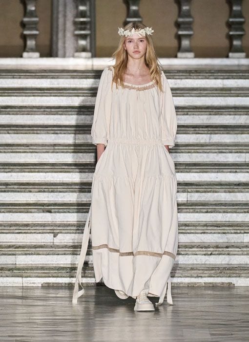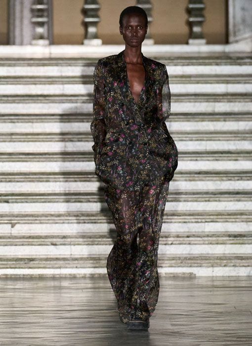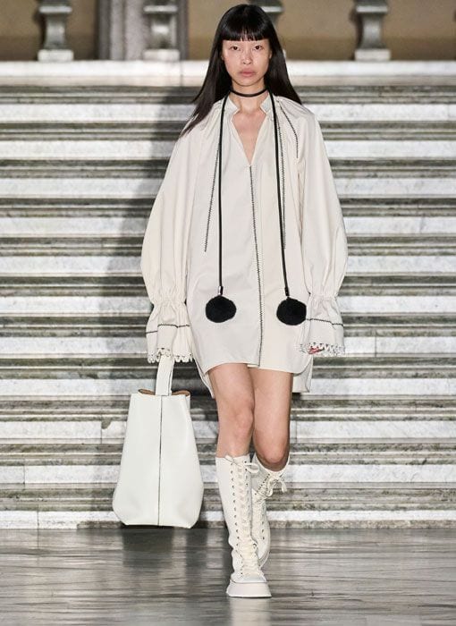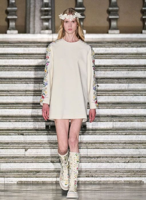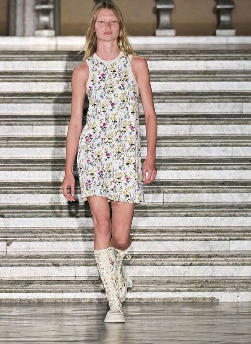 L’ispirazione floreale è un altra grande protagonista della collezione. Stampe di rami e fiori colorati, come se fossero un prato del Midsommar, creano un’atmosfera da sogno. I colletti e i polsini bianchi a contrasto aggiungono un tocco urbano, creando un equilibrio perfetto tra la natura e la città.